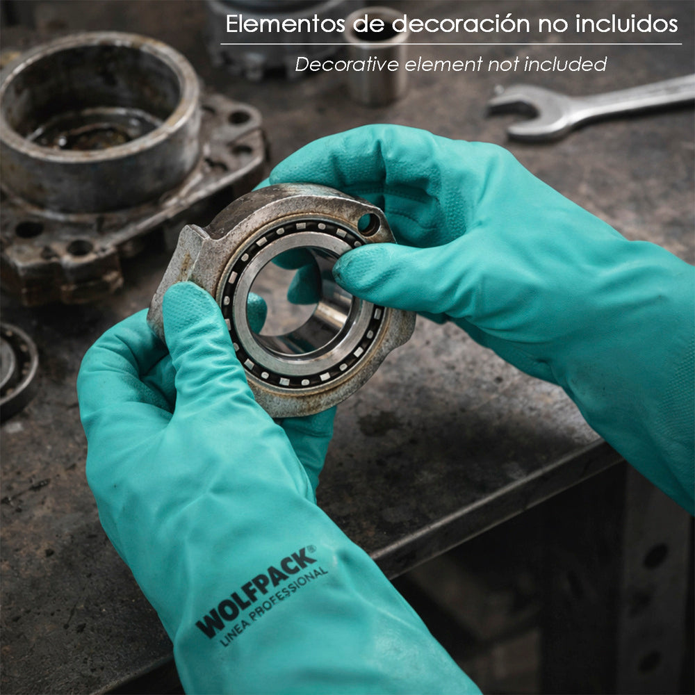 - Con homologación CE CAT.III y certificado EN388, garantiza alta resistencia a aceites, lejías, amoníacos, ácidos, grasas y disolventes, convirtiéndolo en un aliado indispensable en industrias como limpieza, automotriz, imprentas, laboratorios y construcción, entre otros.