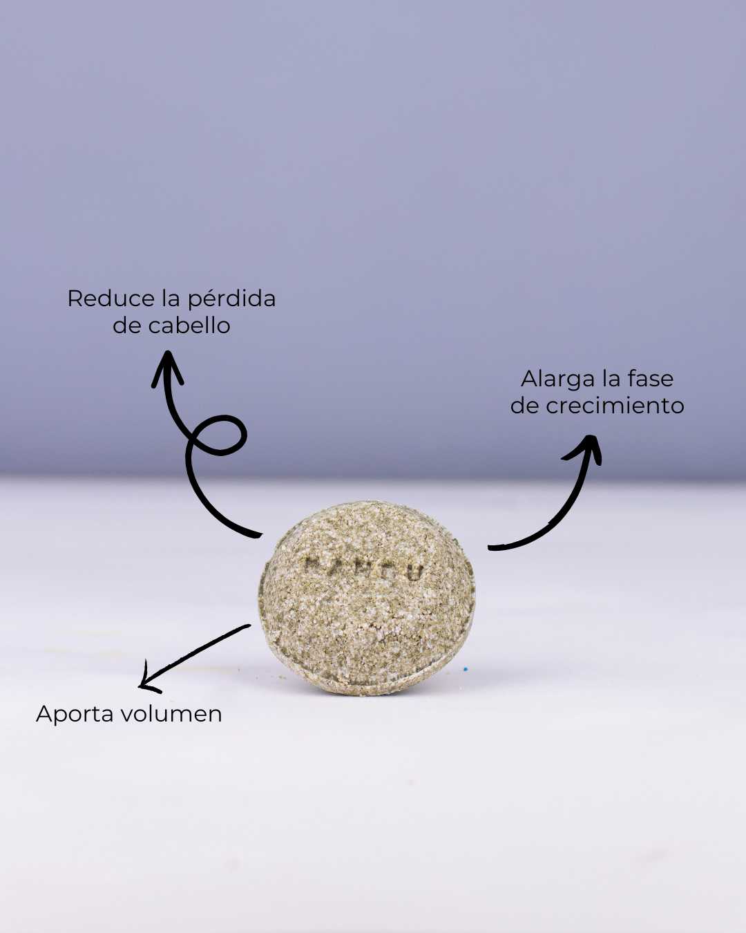 Champú sólido para cabello fino con ácido hialurónico. Ideal para personas con pelo fino que buscan más volumen y densidad, gracias a activos naturales voluminizadores que aumentan la densidad capilar y protegen las fibras desde la raíz.