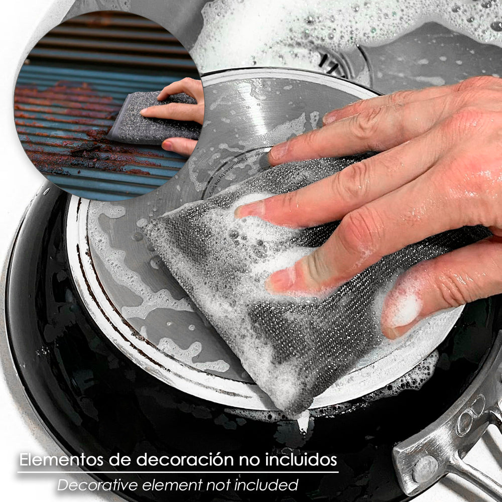 - La malla desincrusta y la esponja interior retiene el agua y el detergente.