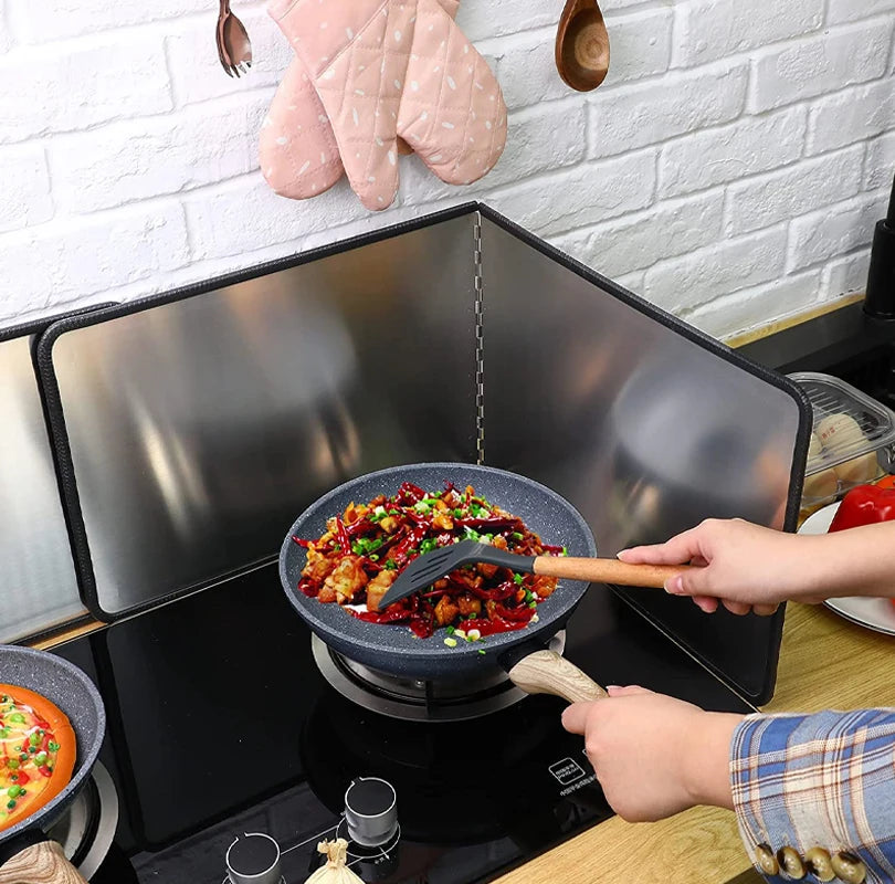 - Splash guard: Prevents oil and grease splashes on walls, countertops, and utensils.