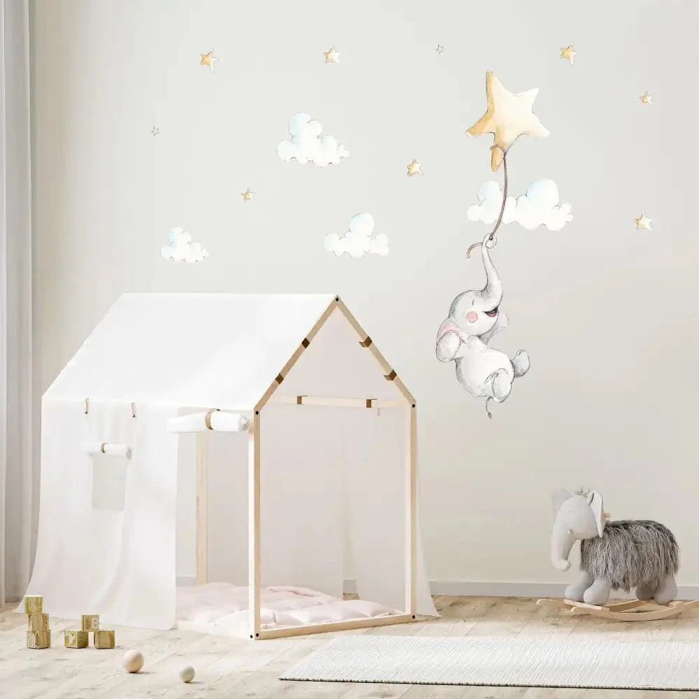 The "Happy Elephant" children's decorative vinyl is a self-adhesive fabric sticker designed to decorate children's spaces, such as walls, doors, or furniture, offering a natural and safe look for children's development.