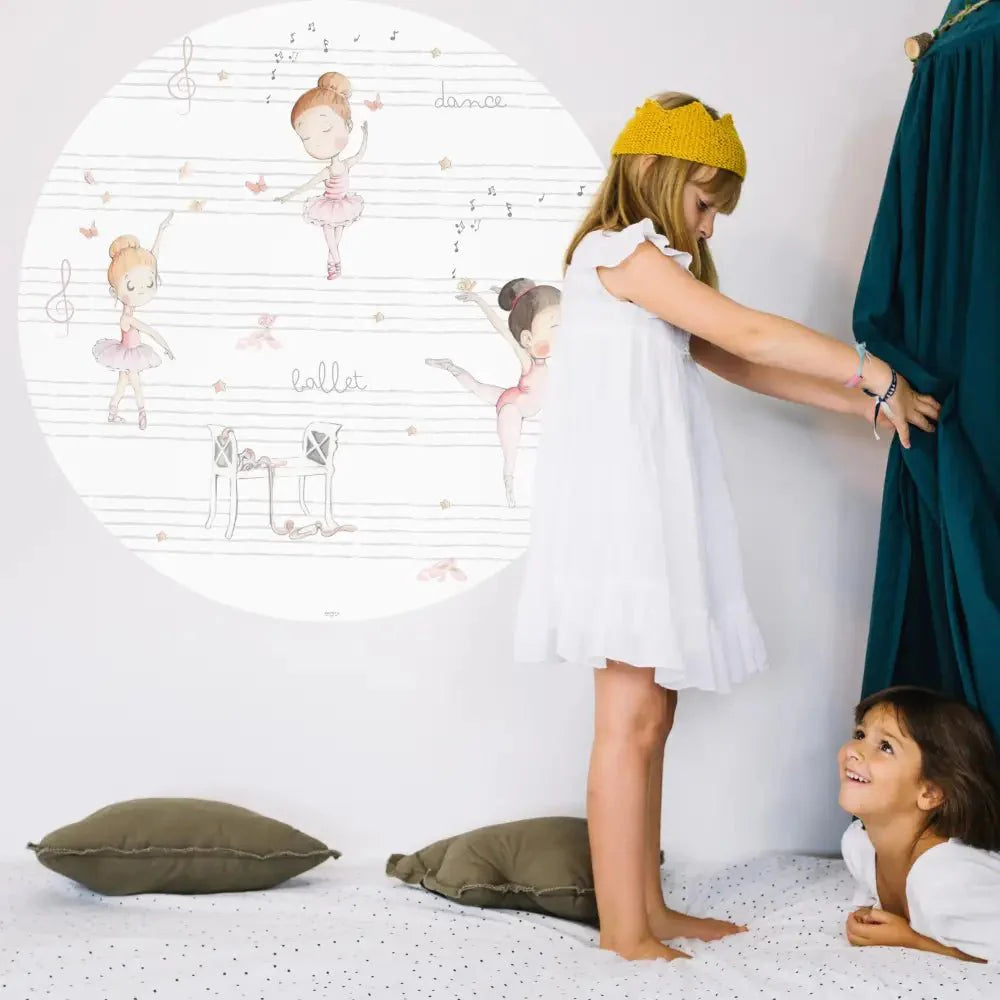 This 95 cm diameter round children's wall decal features a hand-painted watercolor illustration of ballerinas, printed on high-quality vinyl. It's perfect for decorating boys' and girls' rooms, adding a special and magical touch to the space.