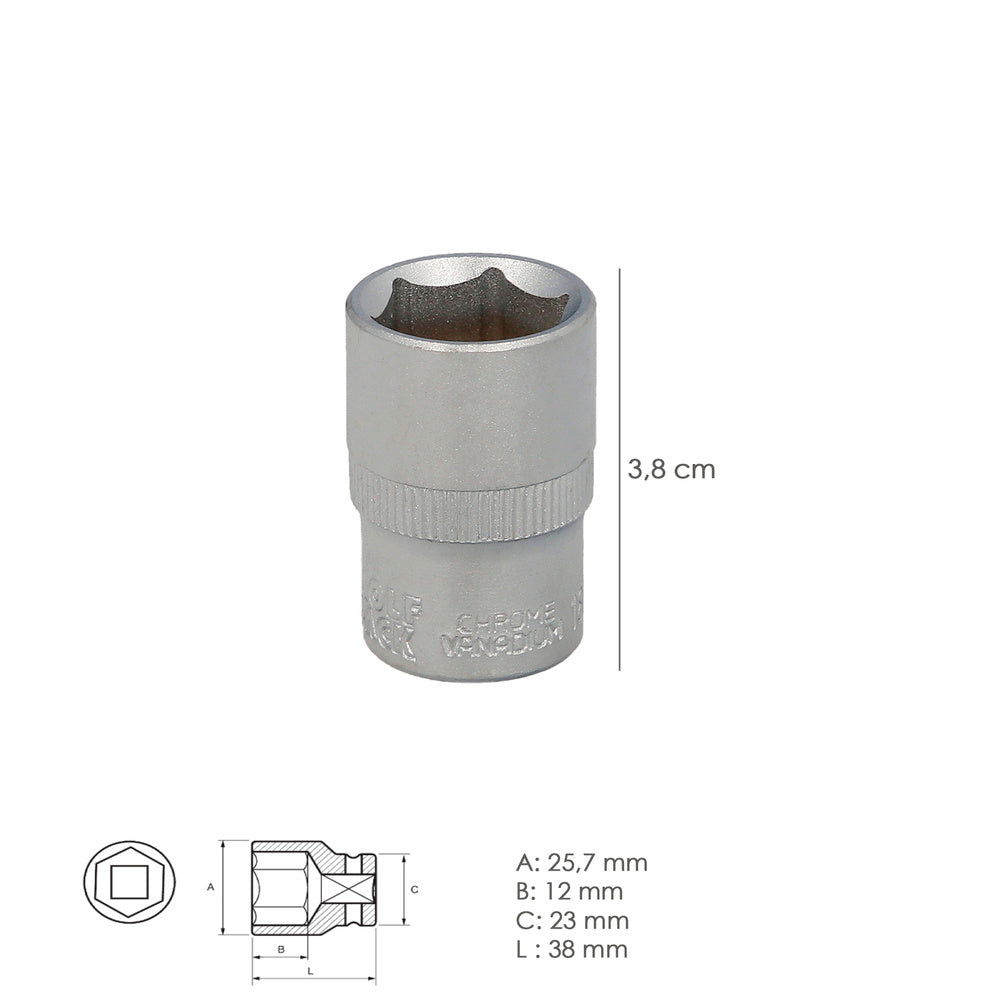 Llave vaso 1/2" hexagonal 19 mm. perfil de 6 caras. acero cromo vanadio, aristas redondas