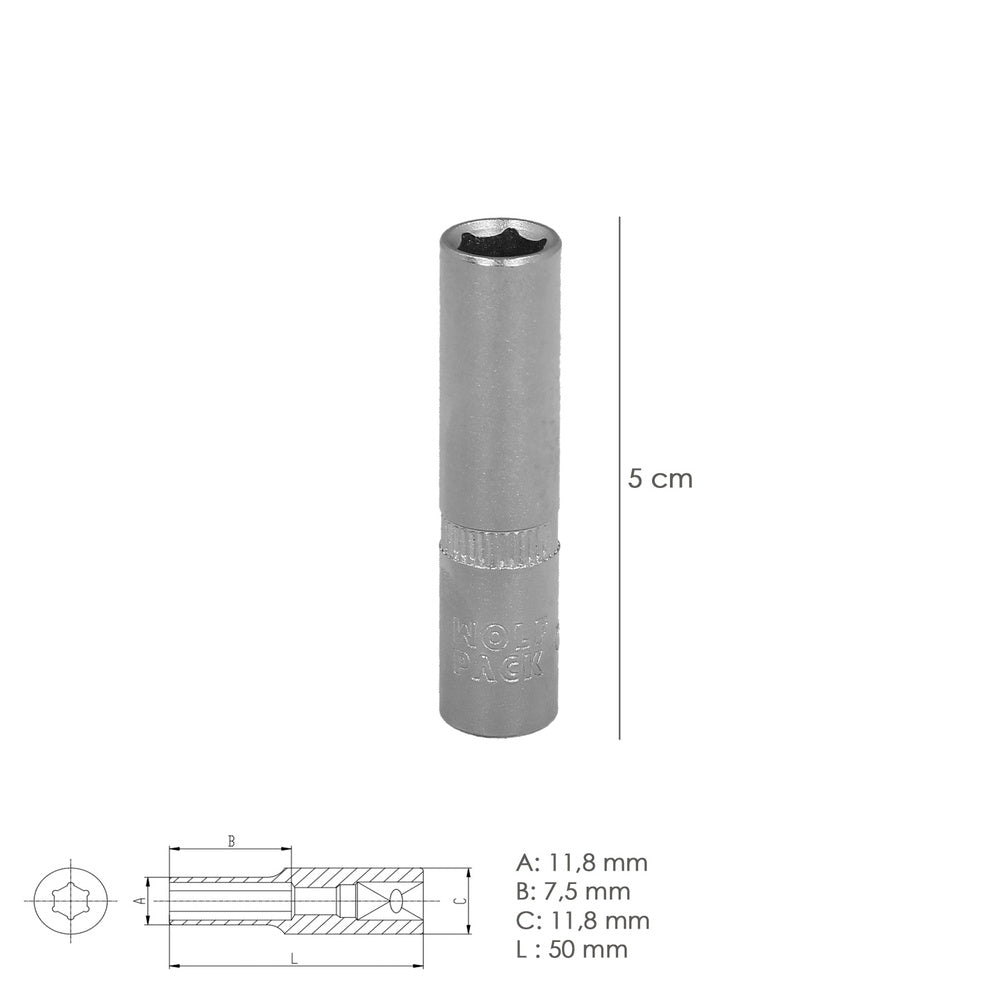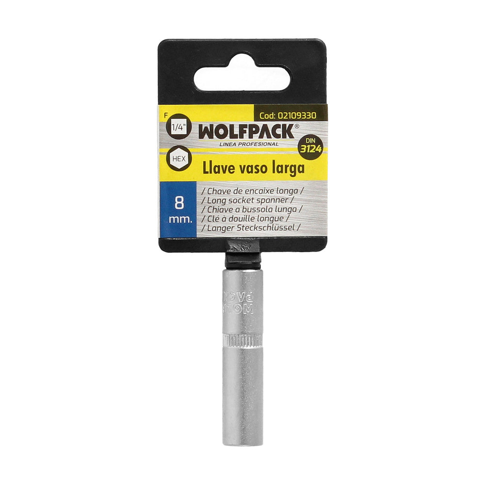 Llave vaso 1/4" hexagonal larga 8 mm. perfil de 6 caras. acero cromo vanadio, aristas redondas