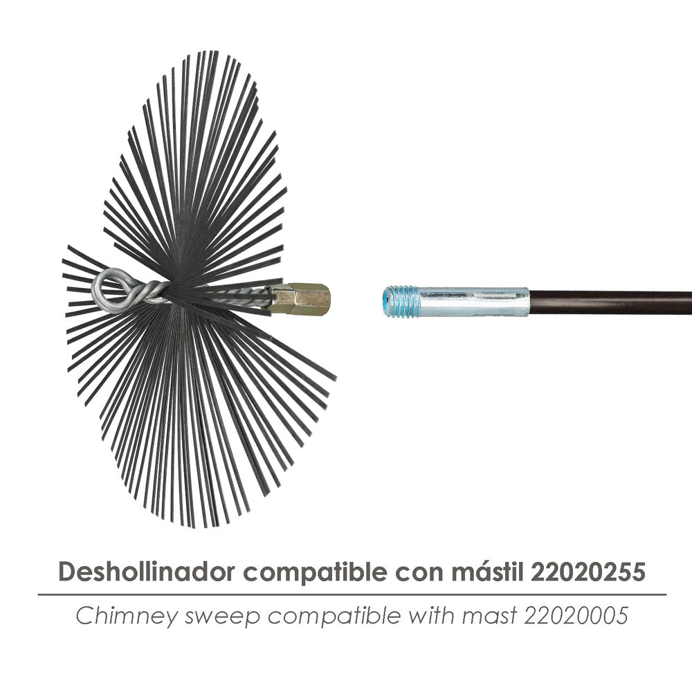 - Su uso es válido para diferentes referencias como el Kit cepillo deshollinador tubo estufa (22020655), el Cepillo limpiador chimenea (22020650) y el mástil deshollinador de 5 tramos de 140 cm (22020635), lo que lo convierte en un complemento ideal para tu kit de mantenimiento.