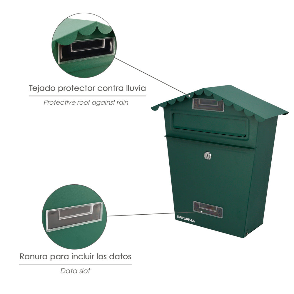Buzon exteriores house verde 330 x 125 x 365 (alt.) mm. con tejado, acero pintado. buzon pared, buzon cartas, buzon correos