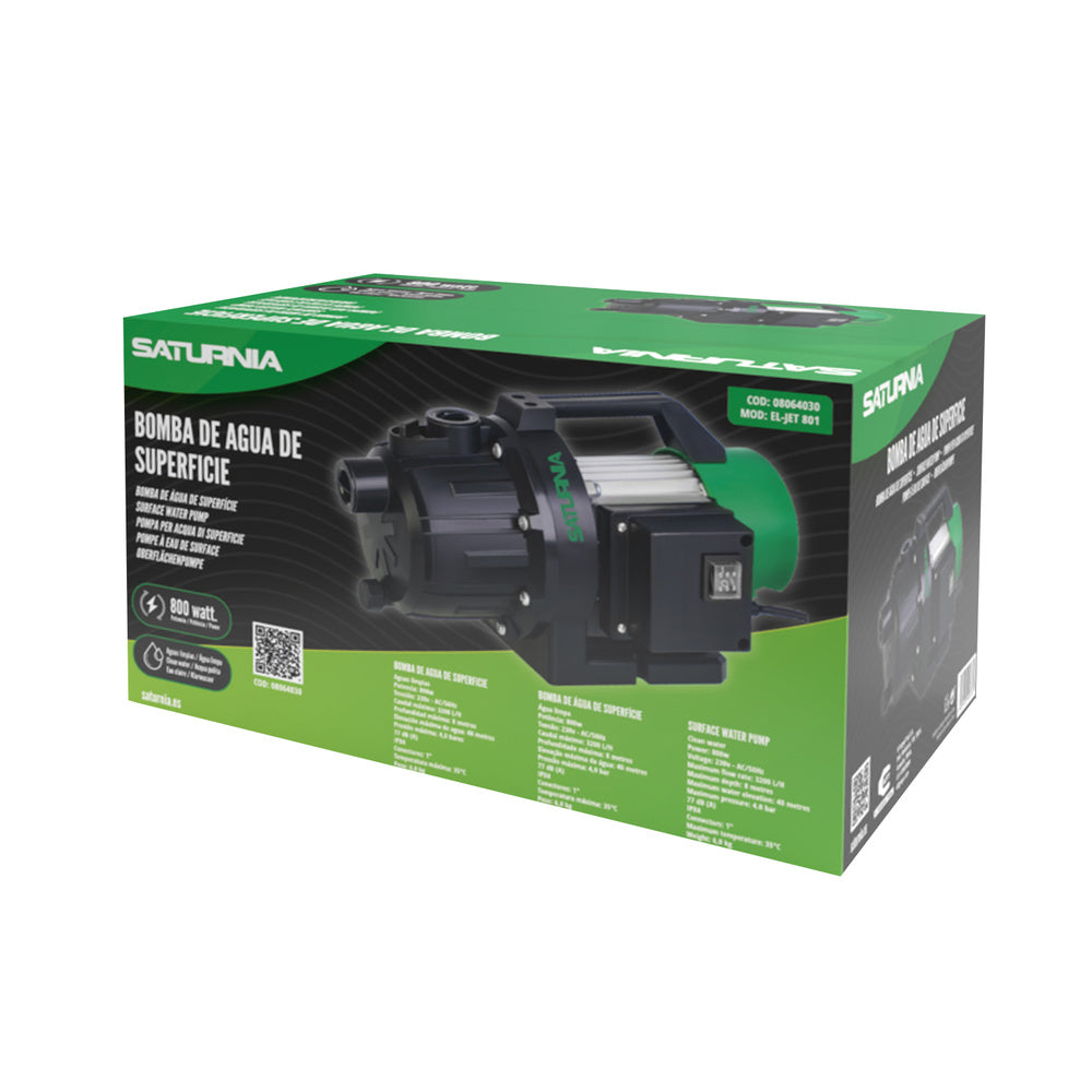 Bomba aguas limpias superficie 800 w. 3.200 lts/hora, profundidad 8 mts, elevación 40 mts. presión max: 4,0 bares