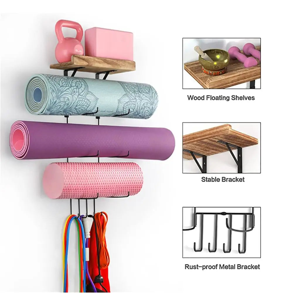 Support mural pour tapis de yoga avec étagère en bois et crochets, idéal pour organiser votre espace yoga ou votre salle de sport à domicile. Grâce à sa conception à trois niveaux, il vous permet de ranger tapis, rouleaux en mousse, serviettes, coussins et autres accessoires, les gardant à portée de main et organisés.