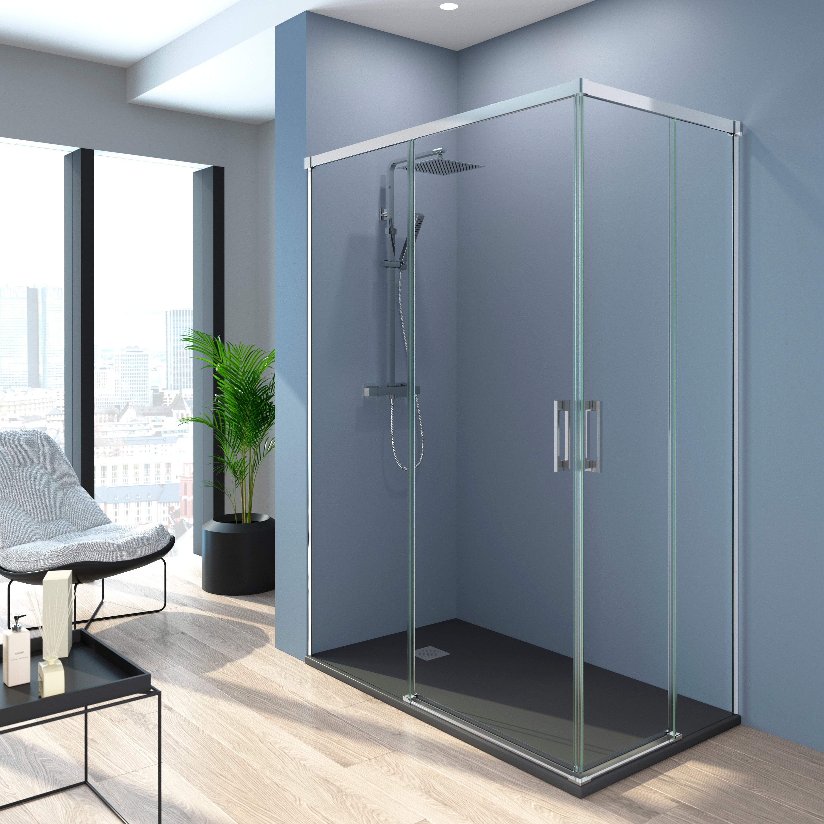 Mampara para plato de ducha rectangular de la serie Nixon de Bathme. Ideal para baños modernos que buscan amplitud visual y un cierre seguro y práctico; su beneficio principal es evitar salpicaduras manteniendo un estilo minimalista.