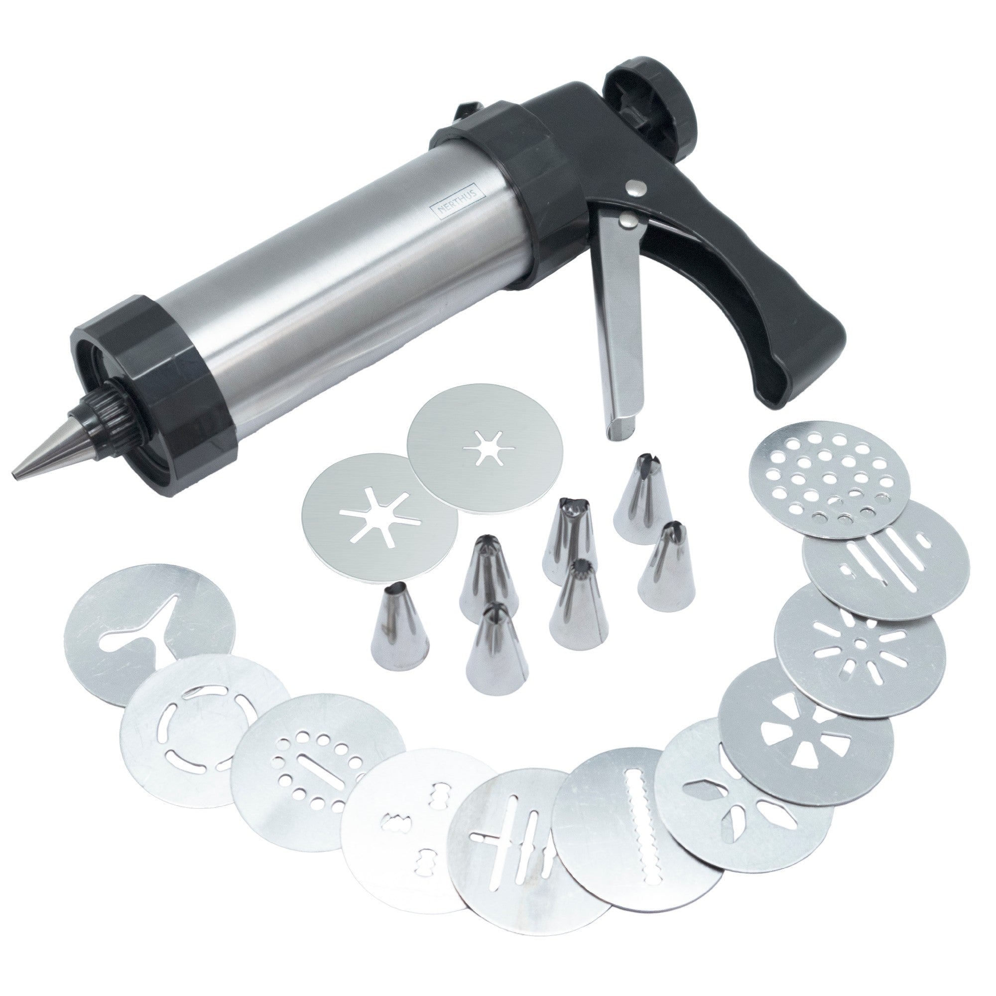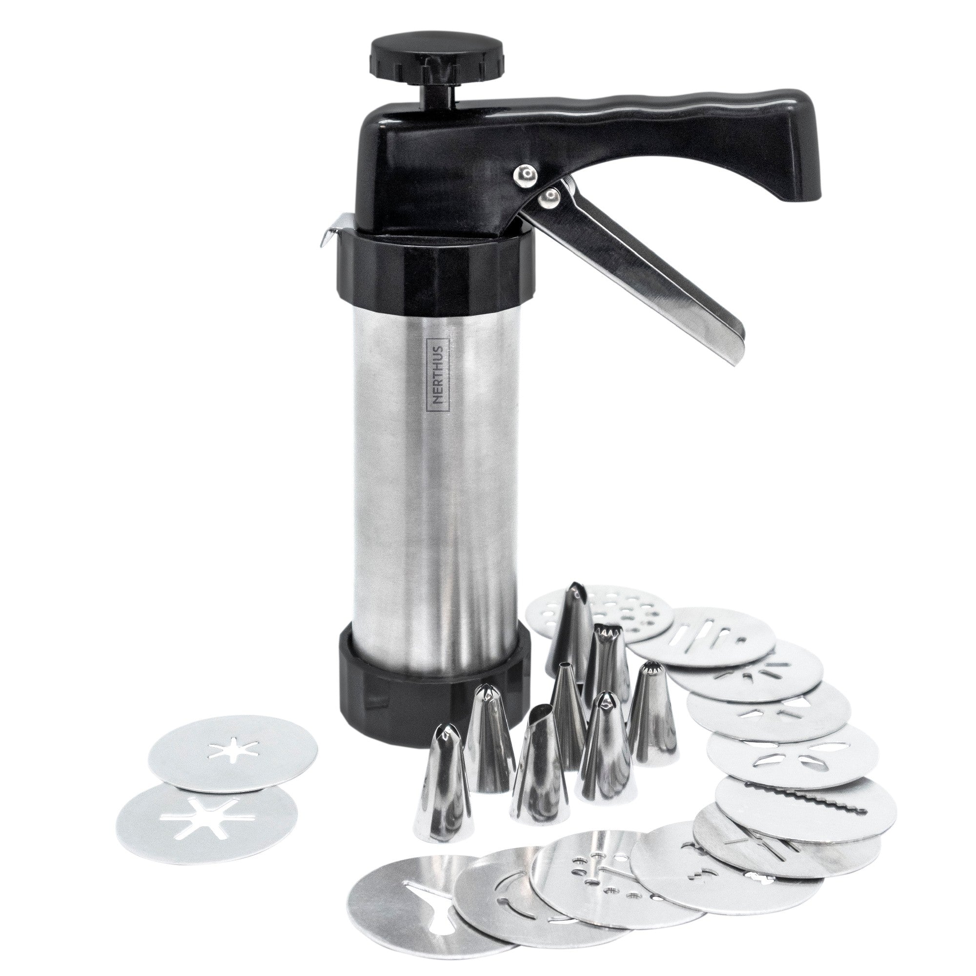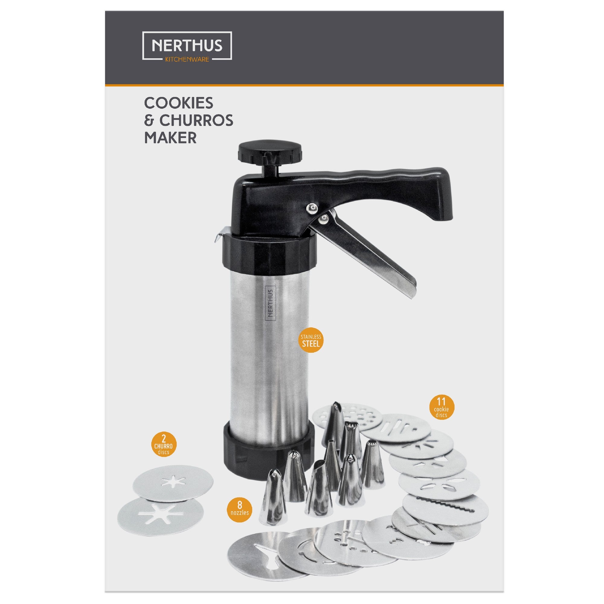 La churrera tipo pistola con boquillas intercambiables de Nerthus es la forma más práctica y divertida de hacer churros caseros en casa. Con su diseño cómodo y funcional, solo tienes que cargar, presionar y ¡listo! Churros perfectos al instante.
