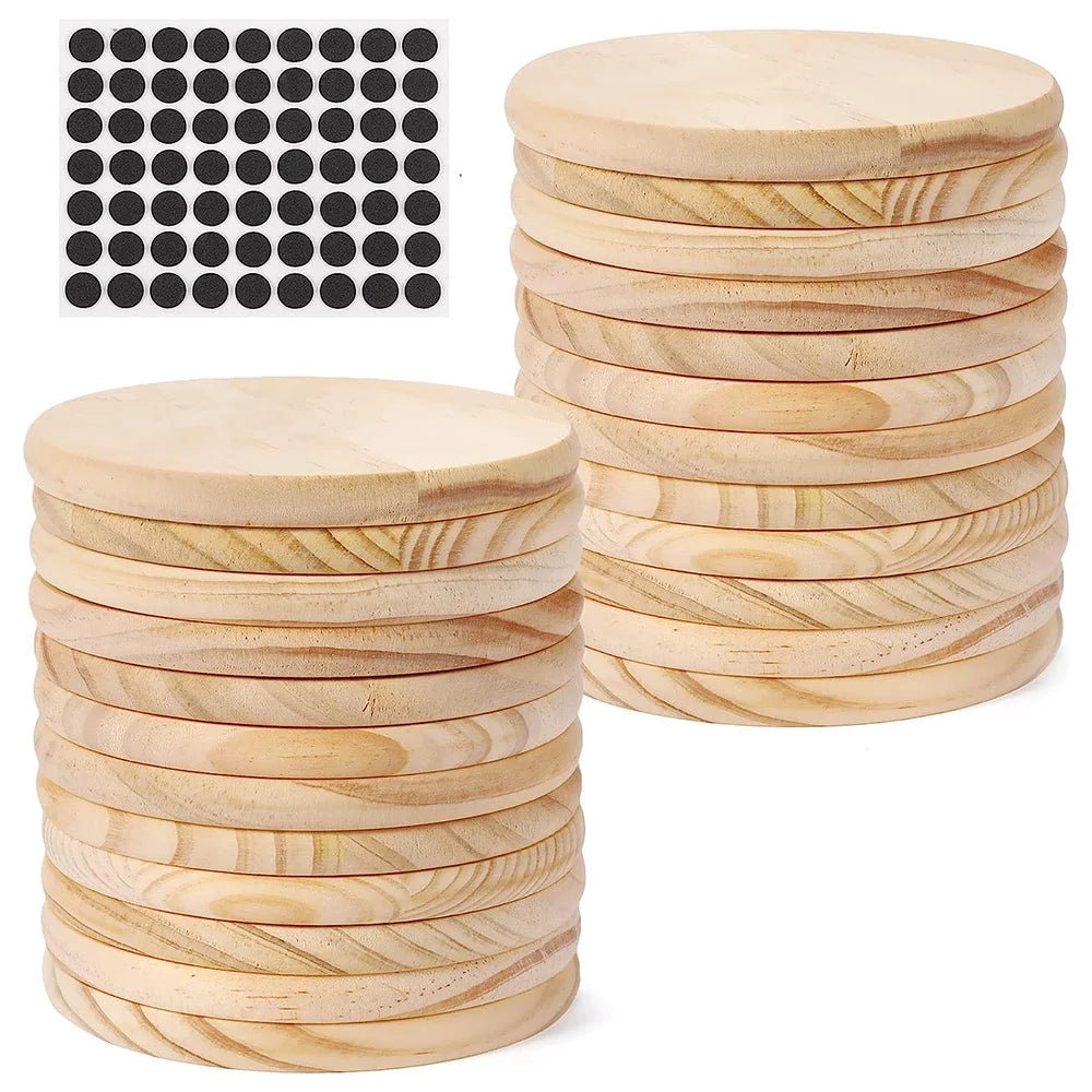Conjunto de 5 posavasos de madera sin terminar, de 10 cm de tamaño. Ideales para quienes buscan personalizar su hogar, ya que su superficie natural se presta para pintar, grabar o decorar según tu estilo.