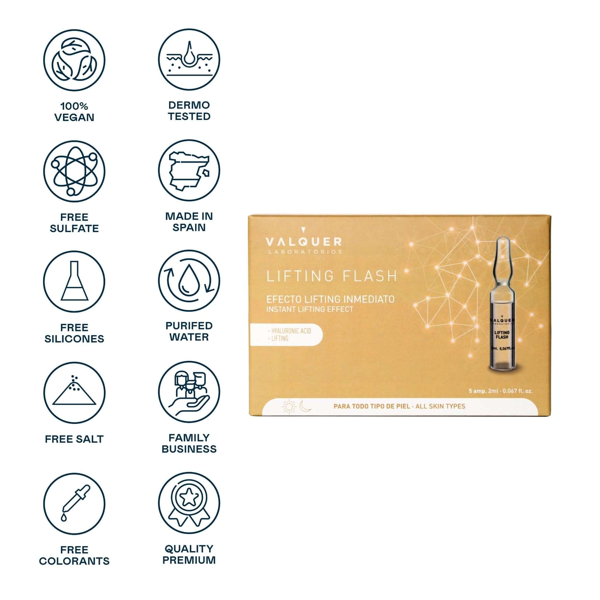 Las Ampollas lifting flash ofrecen un efecto lifting inmediato y prolongado, pensadas para atenuar arrugas y líneas de expresión. Ideales para lucir una piel rejuvenecida y radiante en eventos especiales.