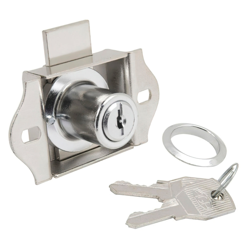 Es una cerradura para cajón cromada, pensada para uso doméstico. Ofrece seguridad básica y una construcción resistente para proteger el contenido del cajón en muebles del hogar.