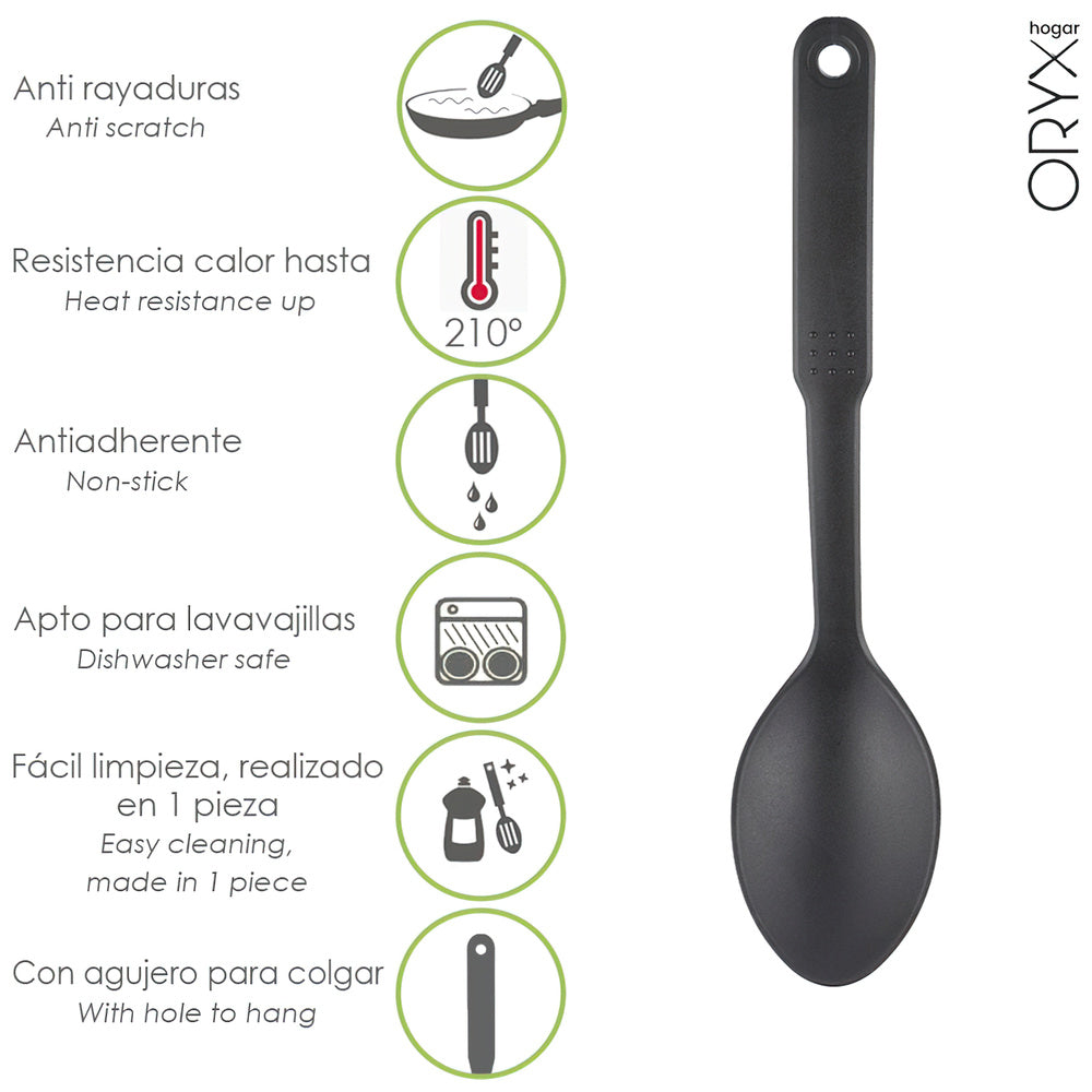 - Realizado en nylon, material ligero y resistente. Material similar a la silicona, ya que ambos materiales no absorven olores ni sabores ademas pueden usarse en todo tipo de sartenes y ollas, ya uqe no rayan la base.