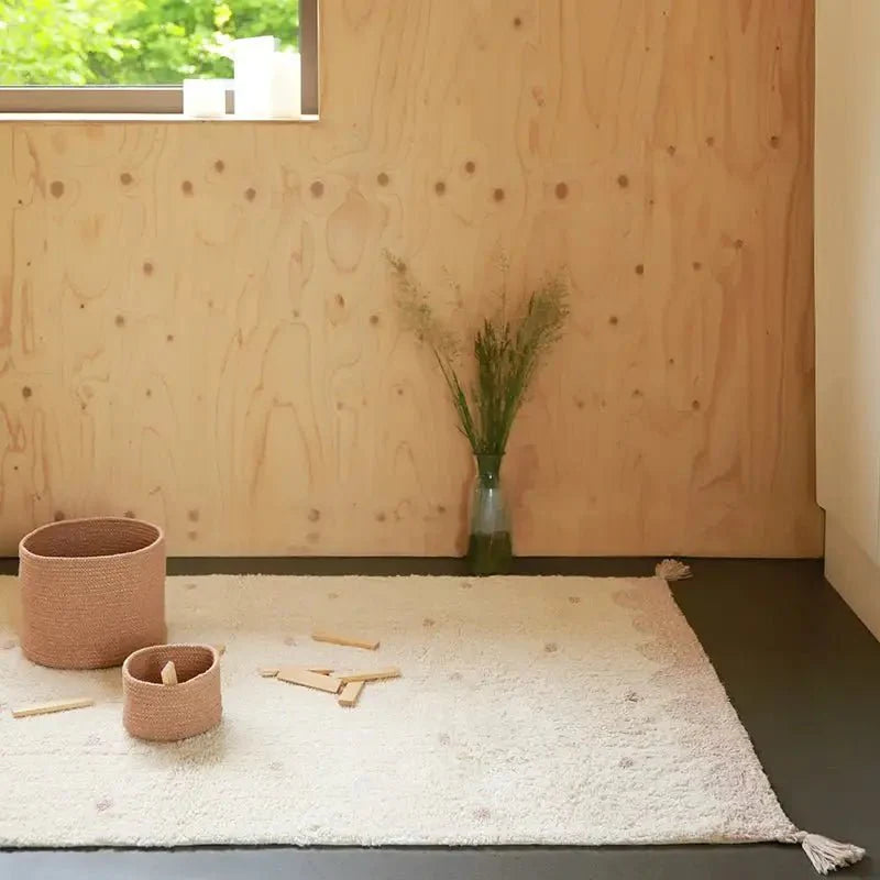 La alfombra de algodón lavable con lunares de MINNA está diseñada para habitaciones infantiles, ofreciendo un material suave y colores suaves que proporcionan comodidad y un toque atemporal al espacio de los más pequeños.