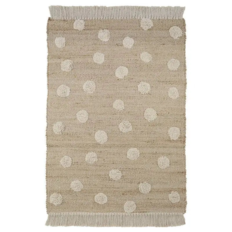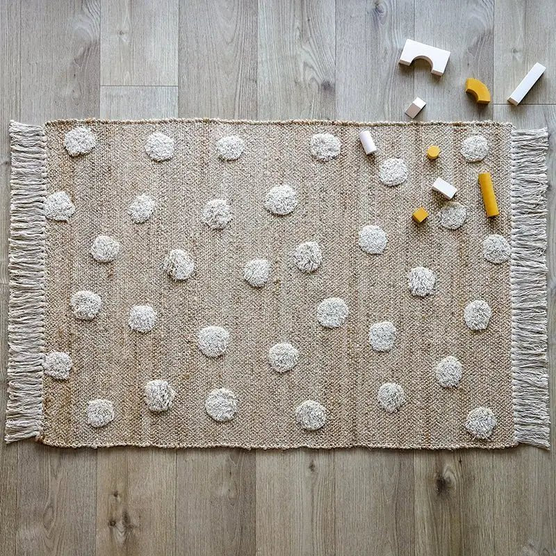 Esta alfombra de jute y algodón con lunares en relieve y flecos es un elemento decorativo natural para el hogar, especialmente adecuado para familias que priorizan la seguridad y el respeto al medio ambiente, gracias a sus materiales sin tintes y su certificación ecológica.