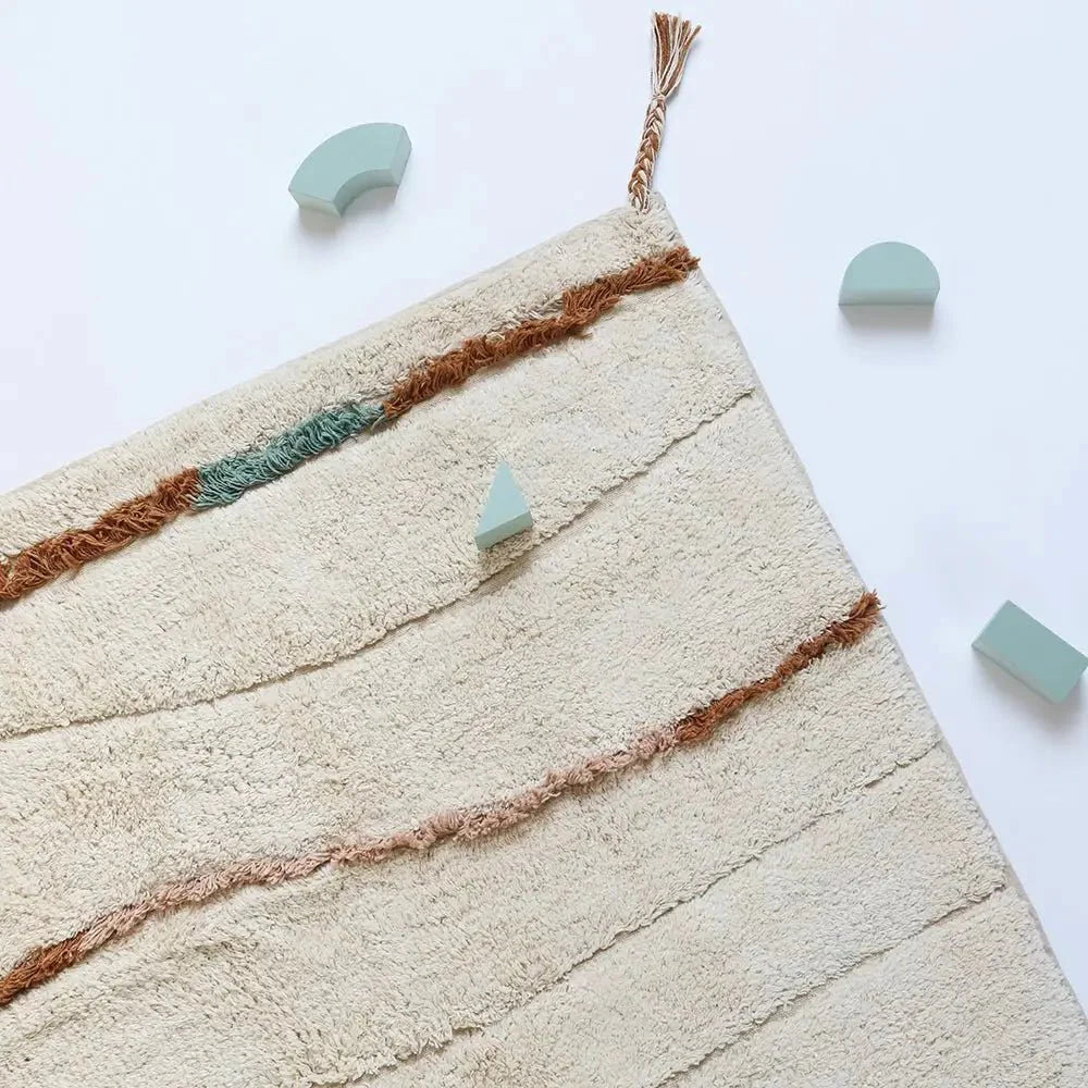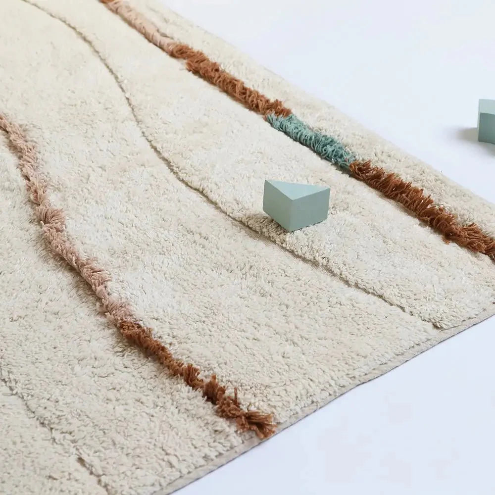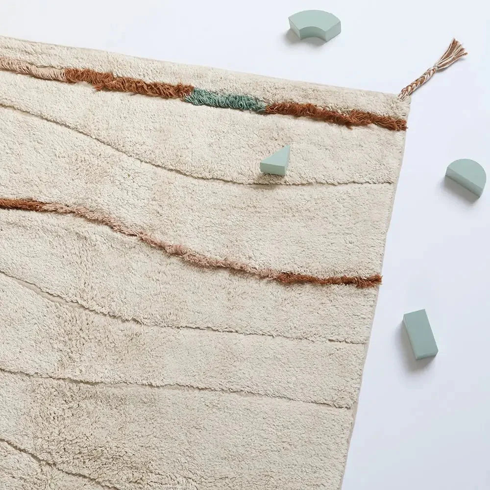 Descubre Serena, una alfombra infantil de algodón con un diseño ondulado que combina líneas naturales y flecos delicados, ideal para el dormitorio de niños al ofrecer un espacio cómodo y seguro para el juego diario.
