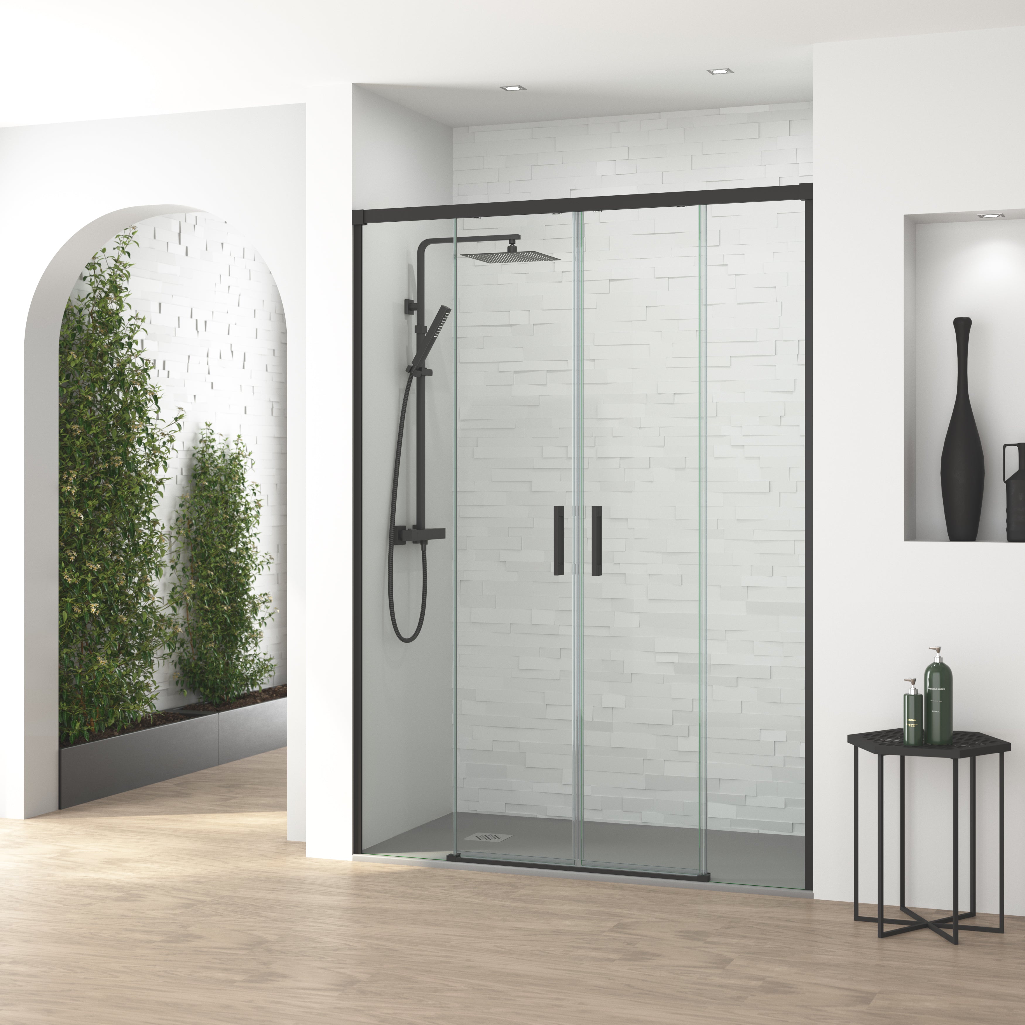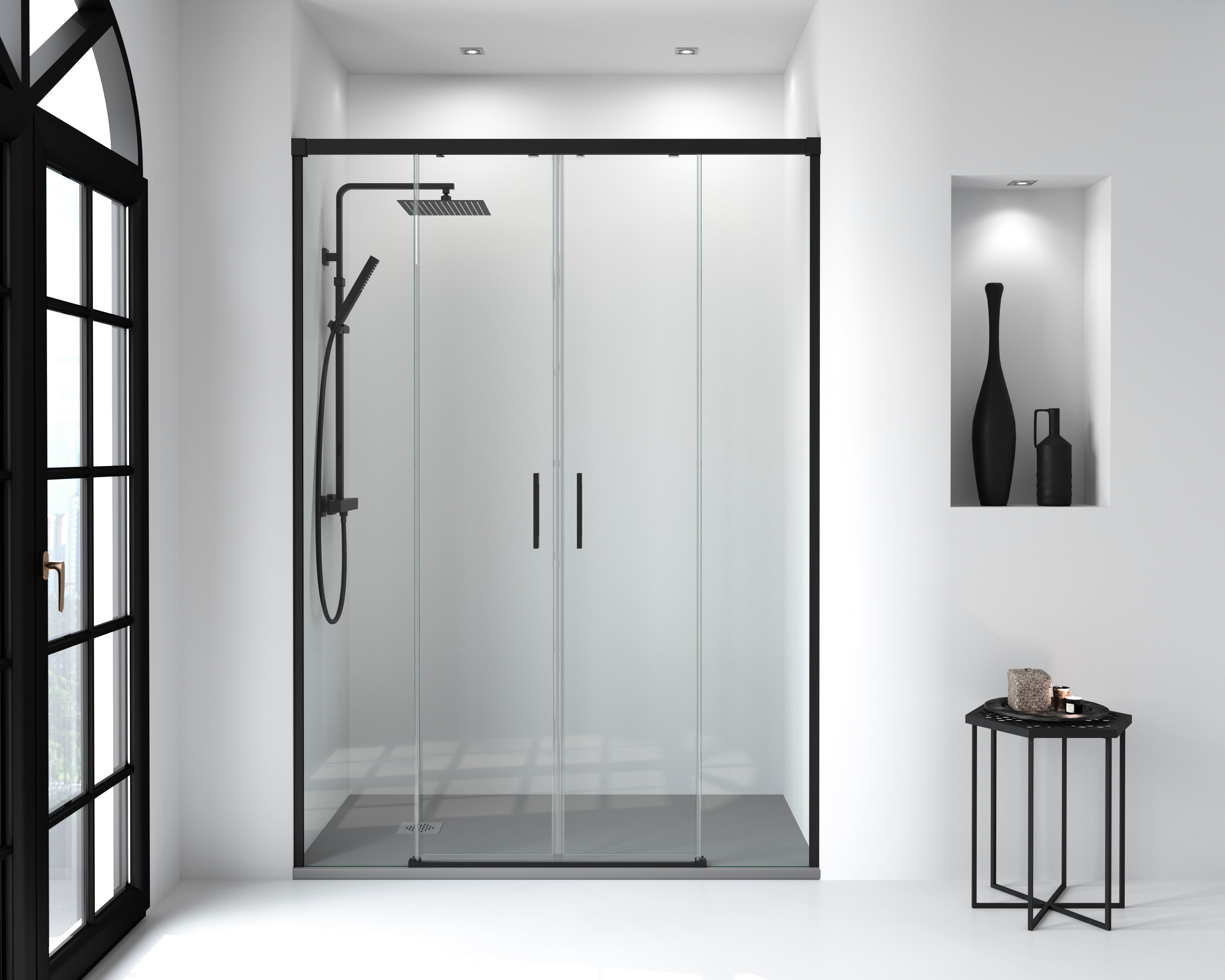 Es una mampara frontal para plato de ducha de la serie Nixon de Bathme, pensada para baños modernos que buscan durabilidad y estilo. Su apertura central con dos hojas fijas y dos puertas correderas ofrece un acceso cómodo y una estética minimalista en negro mate.