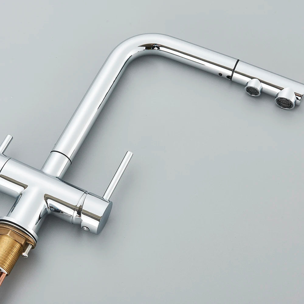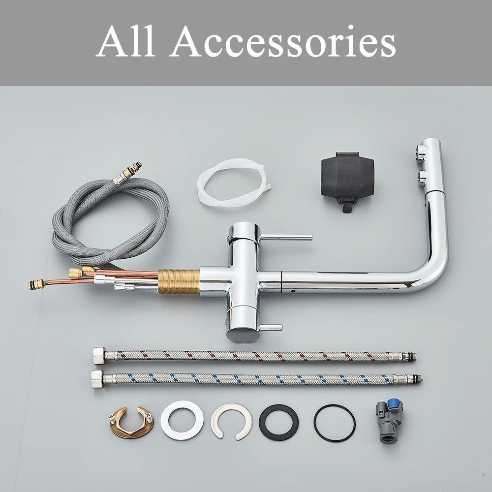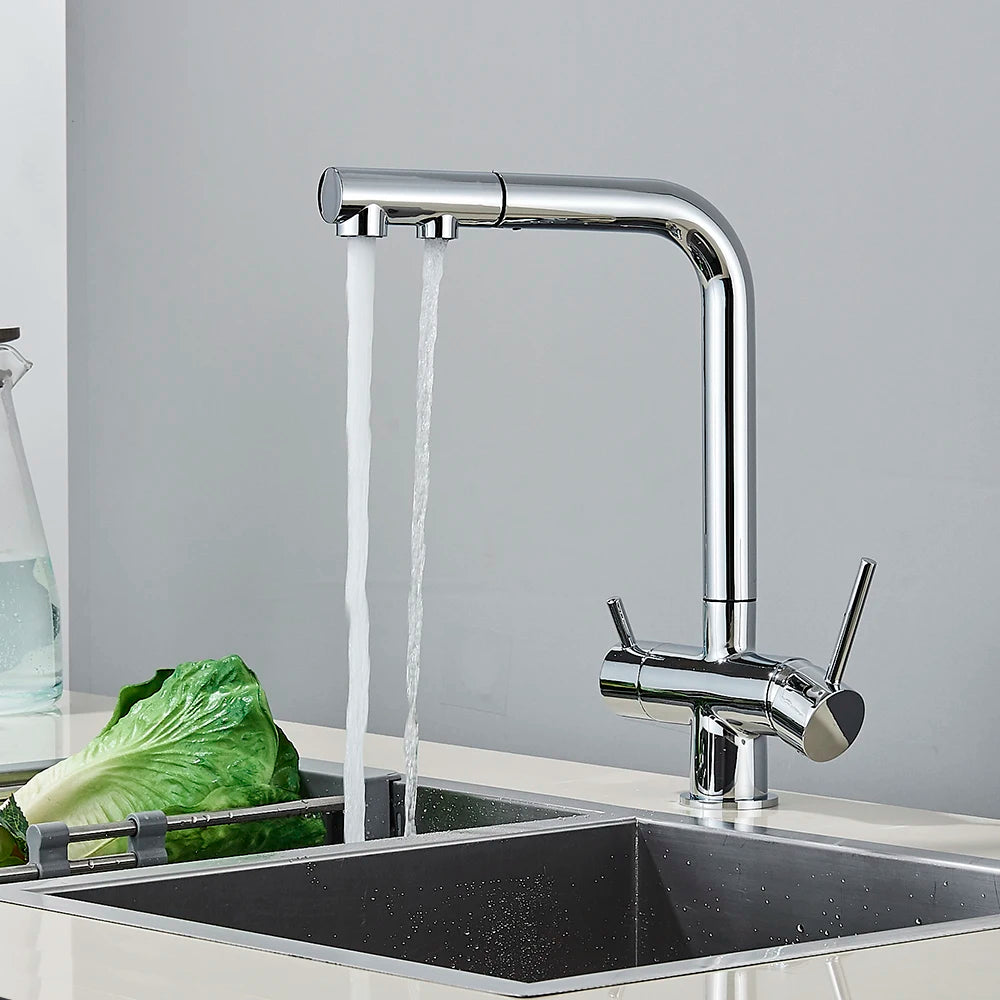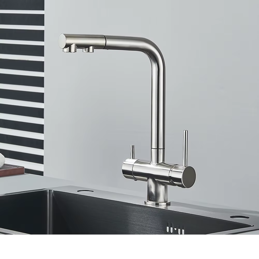 Grifo de cocina mezclador de latón cromado con filtro de agua, diseñado para cocinas modernas que valoran durabilidad y funcionalidad. Ofrece acceso a agua fría, caliente y filtrada de forma rápida y limpia gracias a un cartucho cerámico que previene goteos.