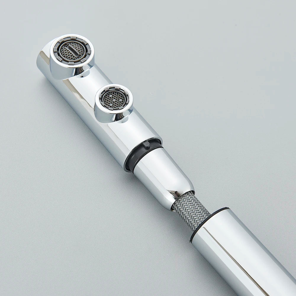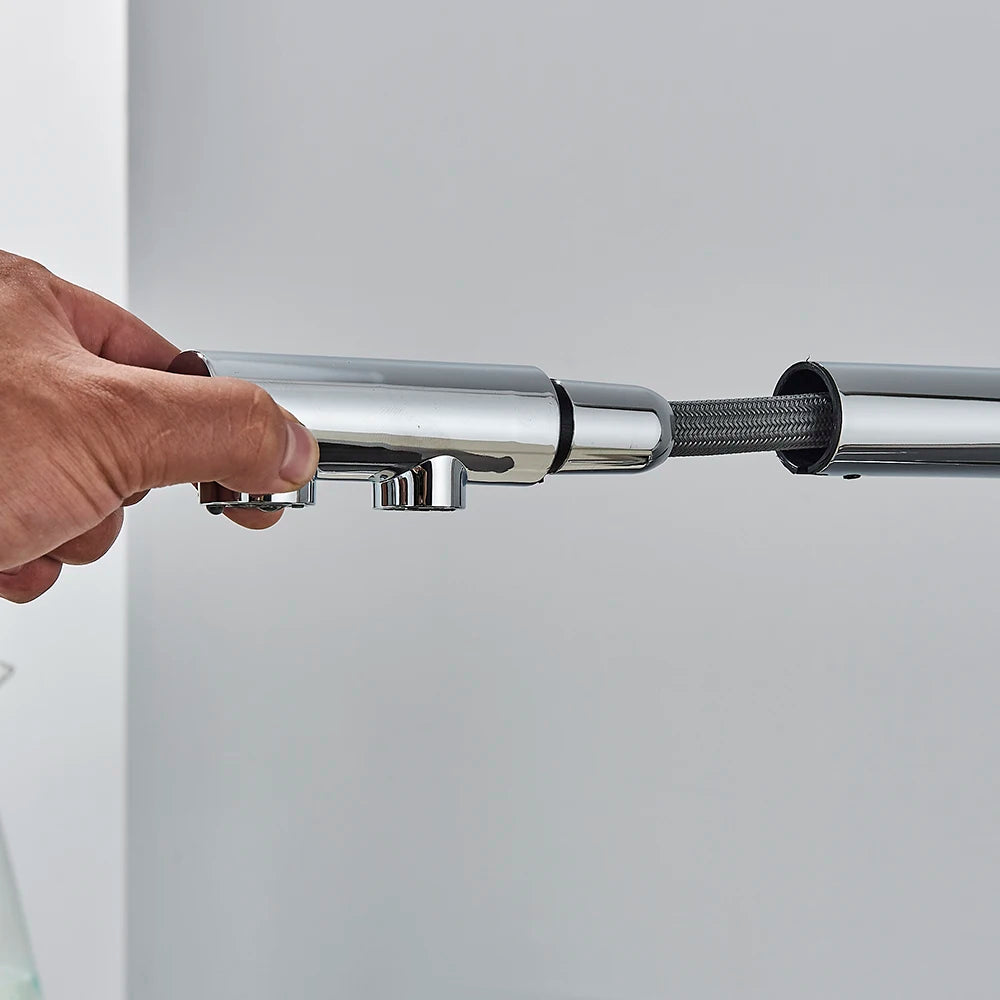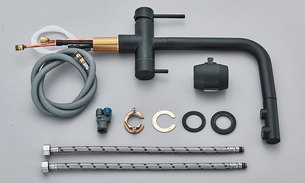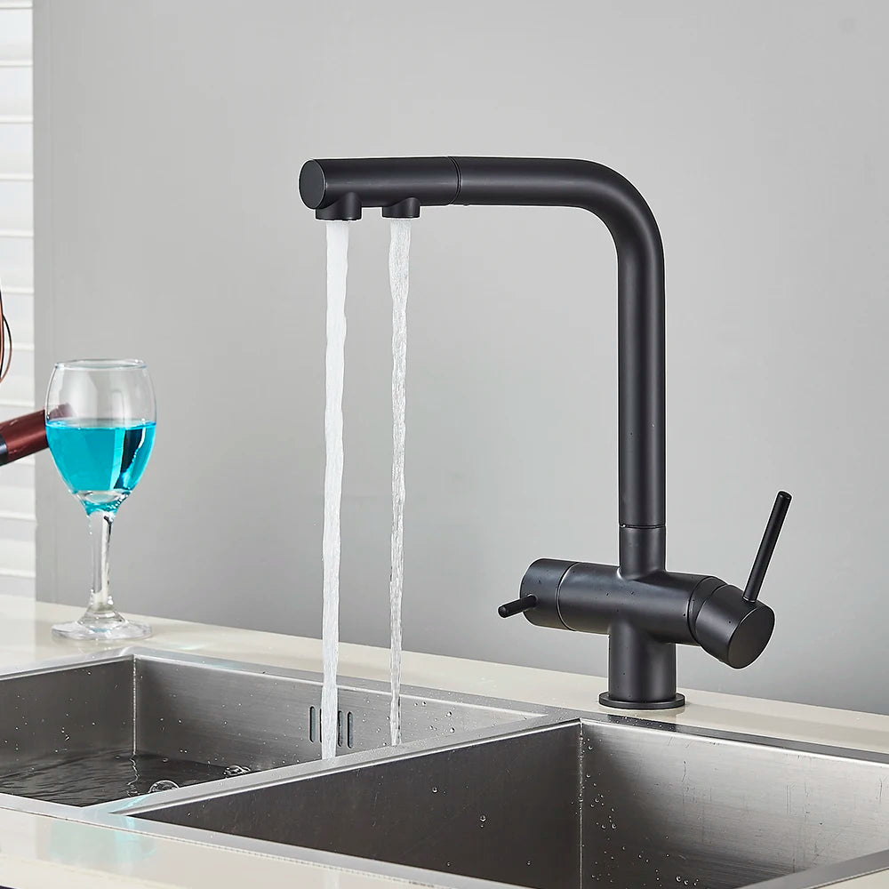 Grifo de cocina mezclador de latón cromado con filtro de agua, diseñado para cocinas modernas que valoran durabilidad y funcionalidad. Ofrece acceso a agua fría, caliente y filtrada de forma rápida y limpia gracias a un cartucho cerámico que previene goteos.