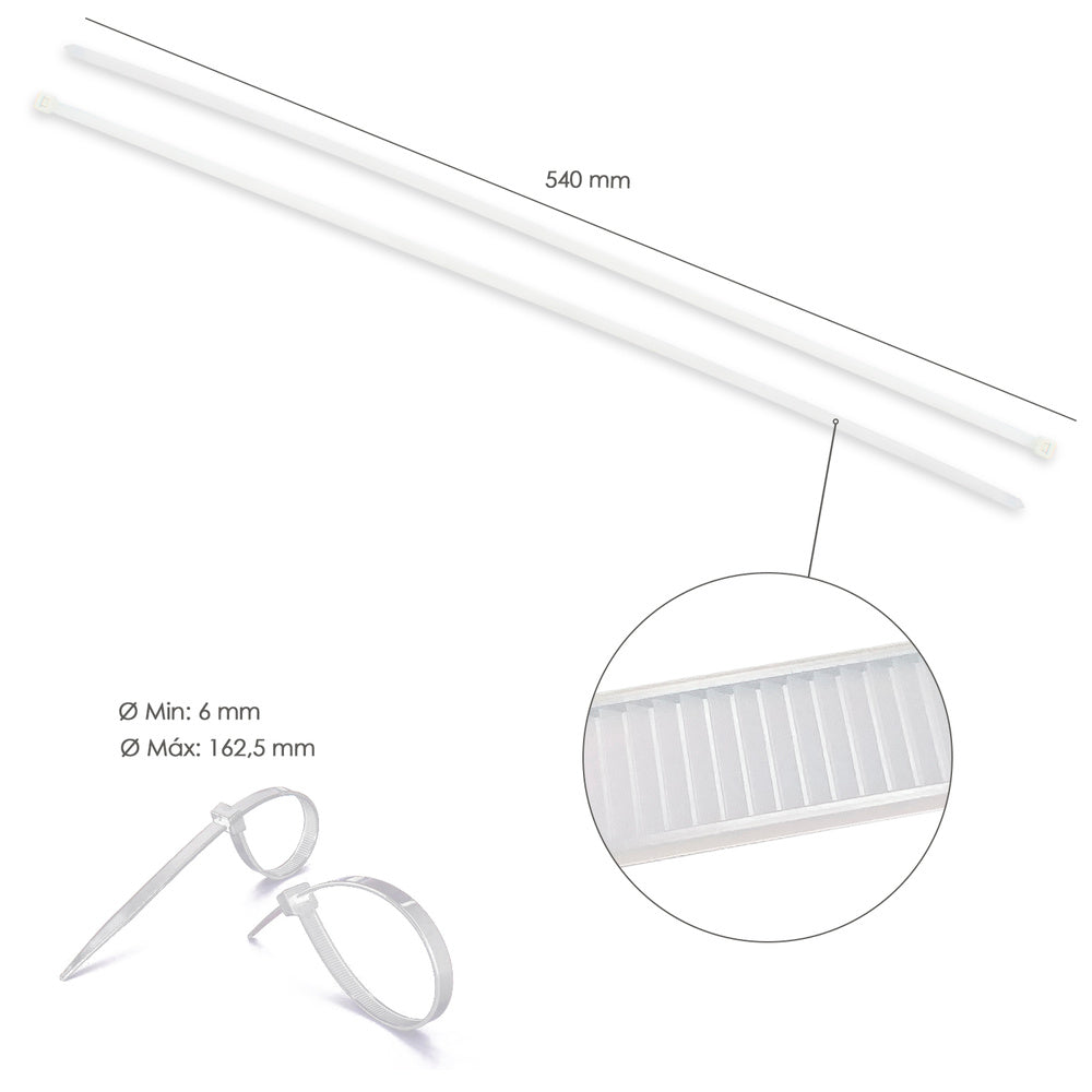 Brida nylon 100%. color blanco / natural 7,8 x 540 mm. 100 piezas. abrazadera plástico, organizador cables, alta resistencia