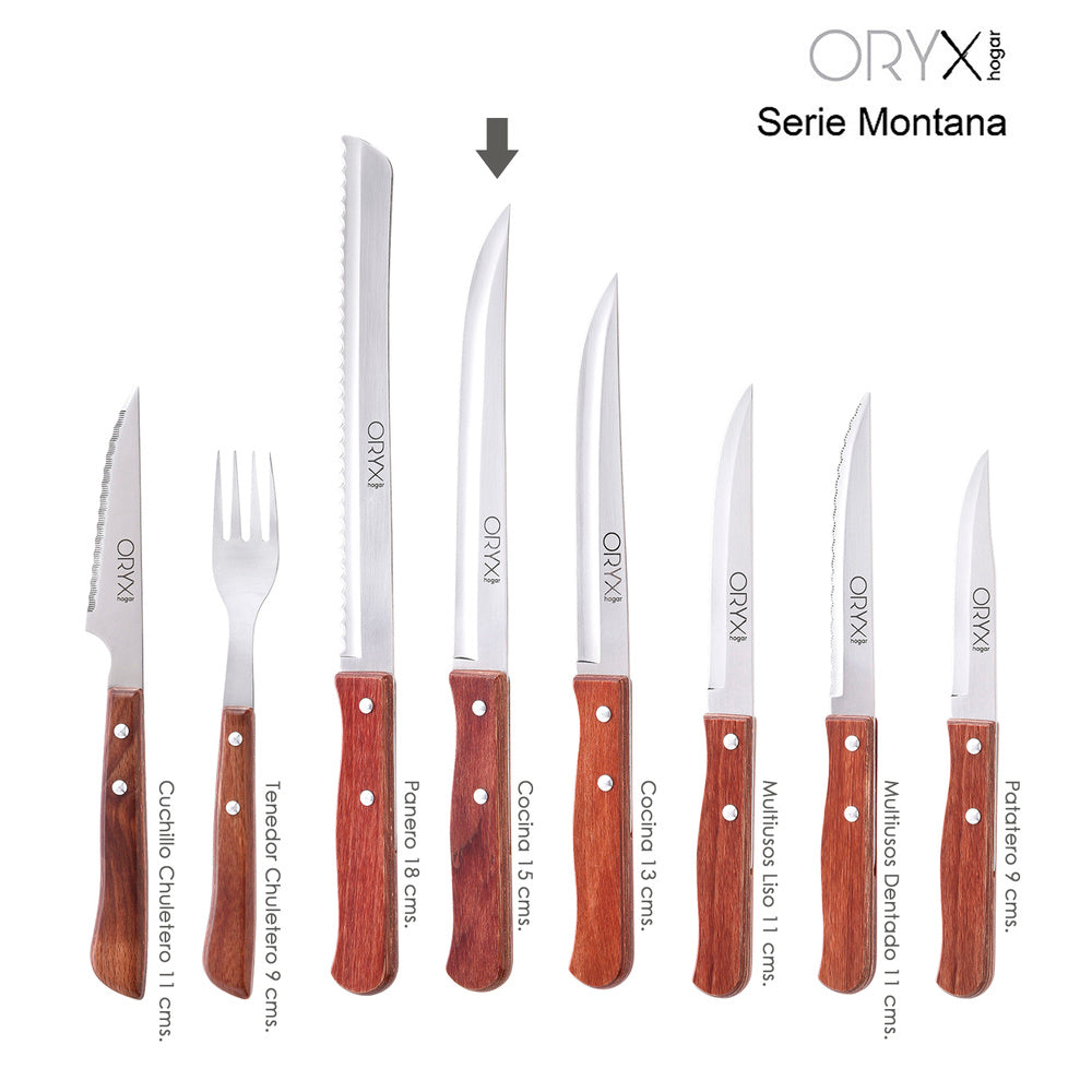 - La serie Montana se define por su parecido con maderas naturales, fabricados en acero inoxidable, de hoja estrecha y mango de madera prensada, se trata de un diseño clasico, funcional y resistente, caracteristicas que hacen que su duración sea larga, incluso con usos frecuentes.
