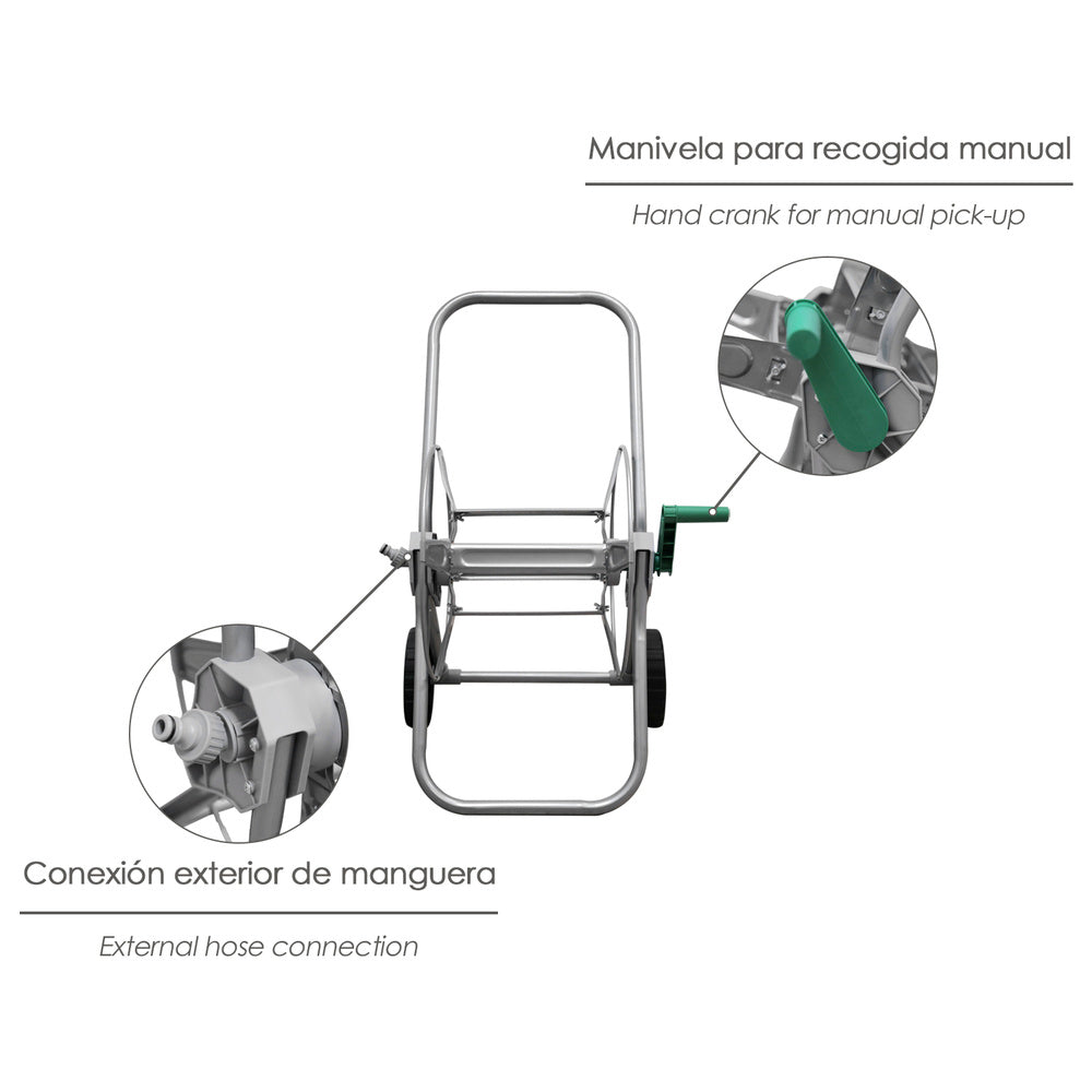 - Puede recoger hasta 50 metros de manguera de 1/2". Manivela incorporada.