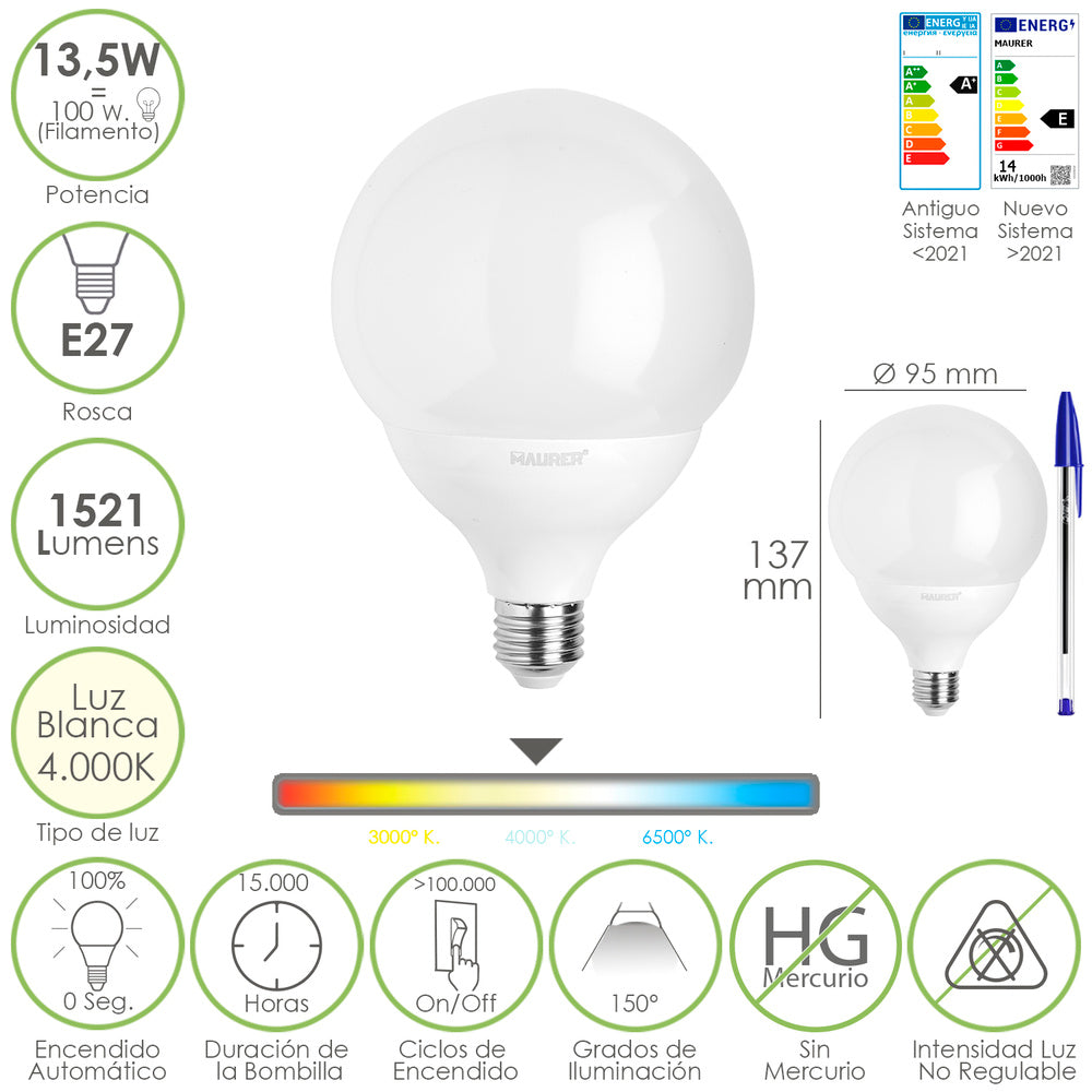 Bombilla Led Esfera Globo E27. 13,5 Watt. Equivale A 100 Watt. 1521 Lumenes. Luz Neutra 4000º K.