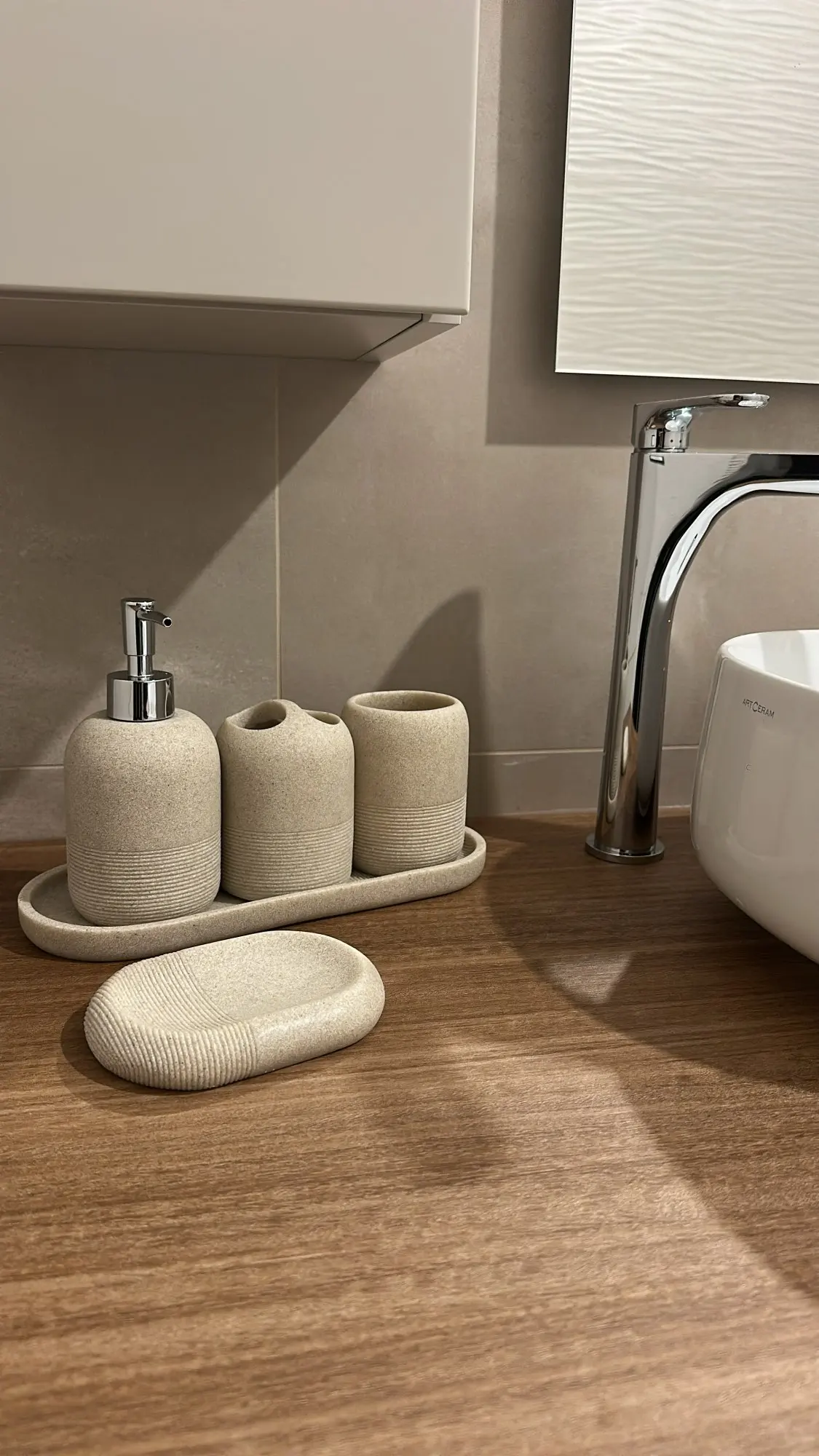 • Color y acabado: Tonos gris/beige con textura sutil que se adapta a cualquier estilo de baño.