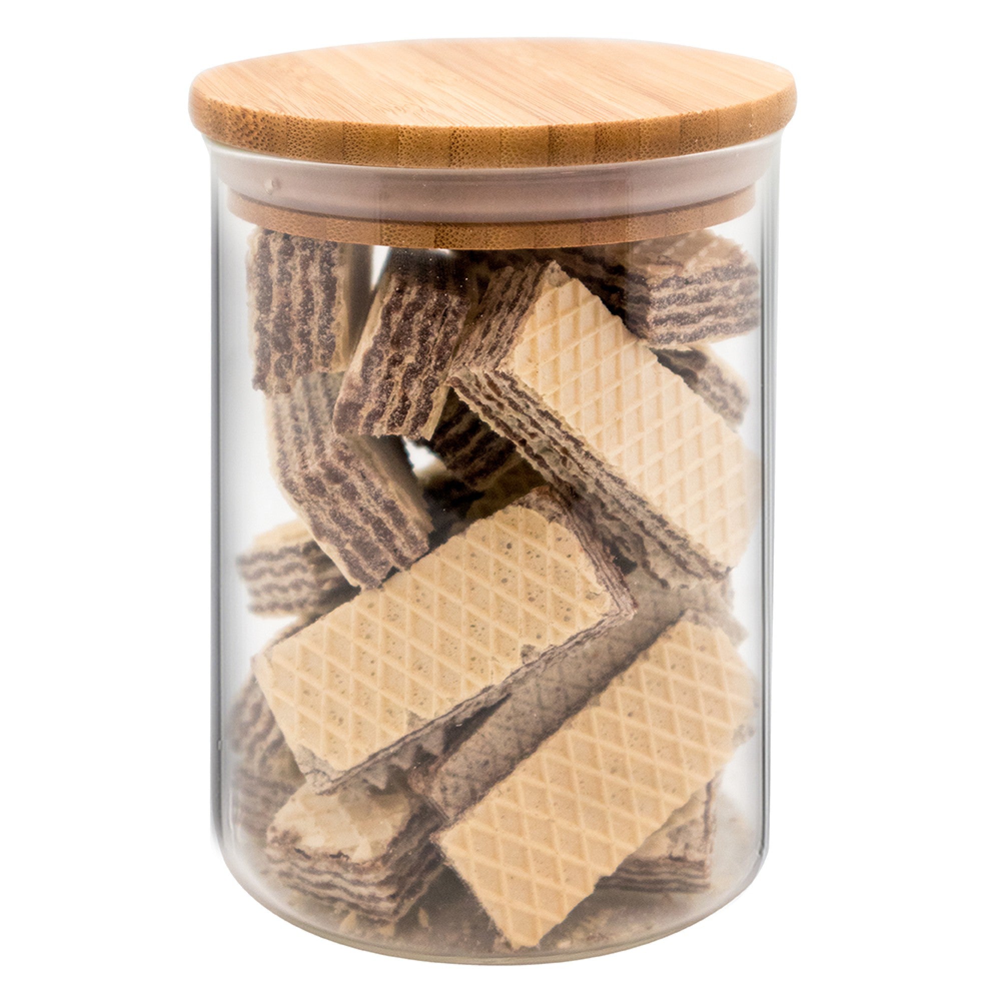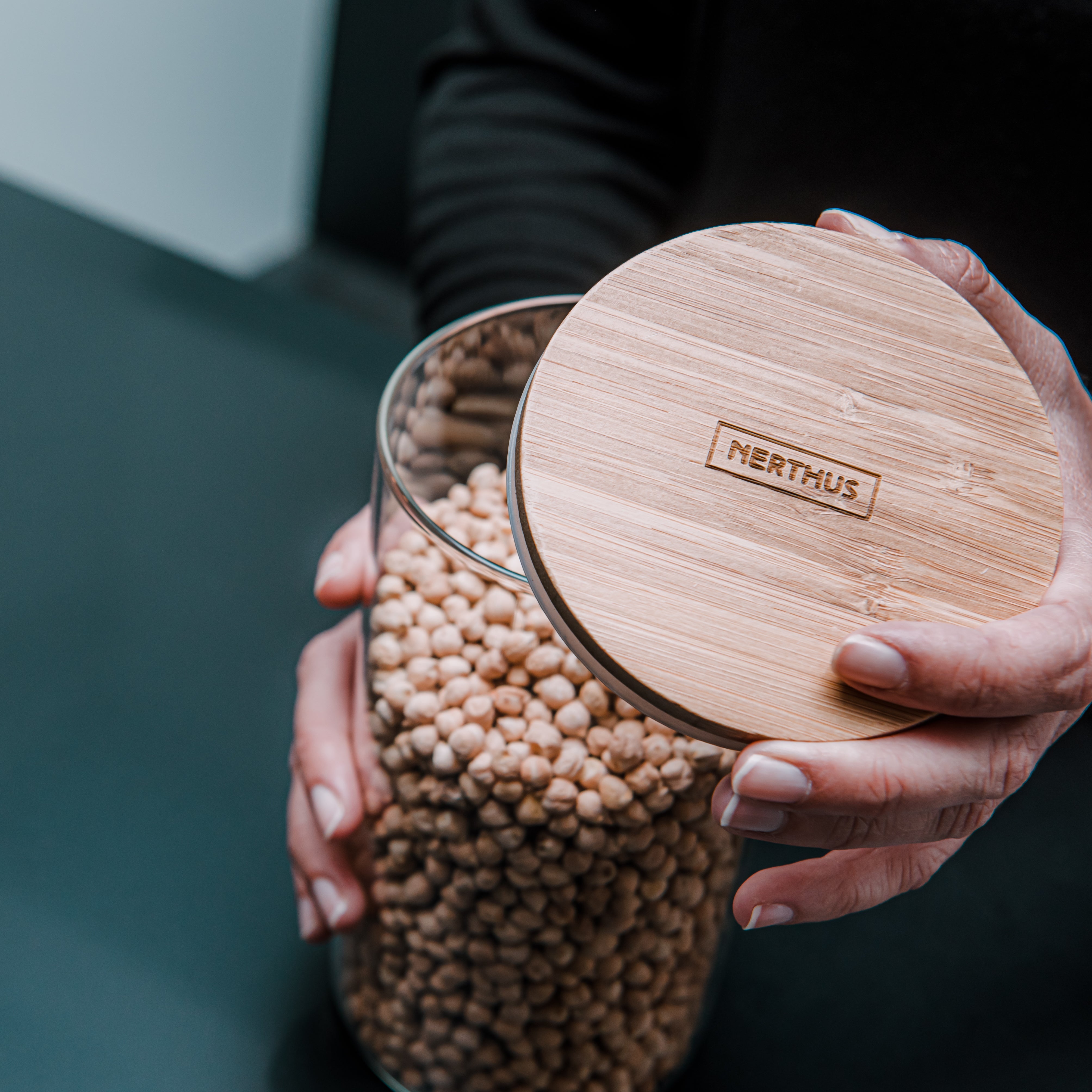 Organiza tu cocina con estilo y funcionalidad con el Tarro Hermético de Cristal Redondo con Tapa de Bambú de Nerthus, el complemento perfecto para mantener tus alimentos frescos y bien conservados.