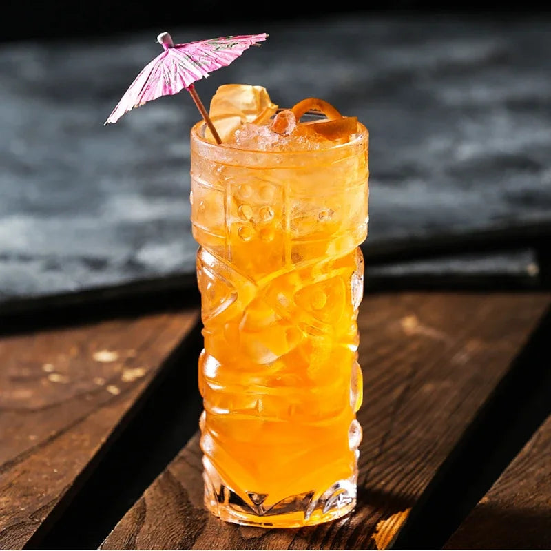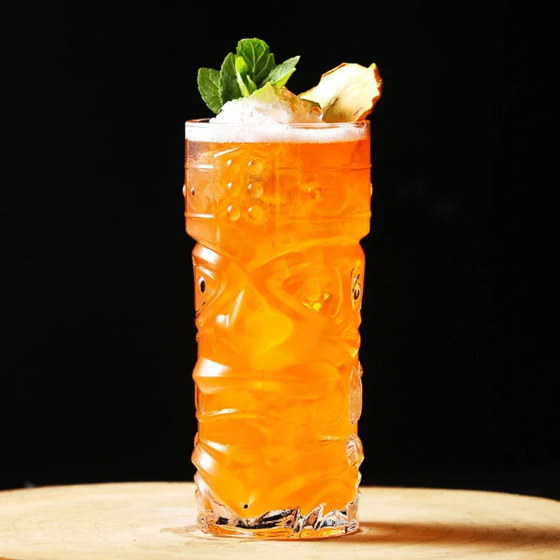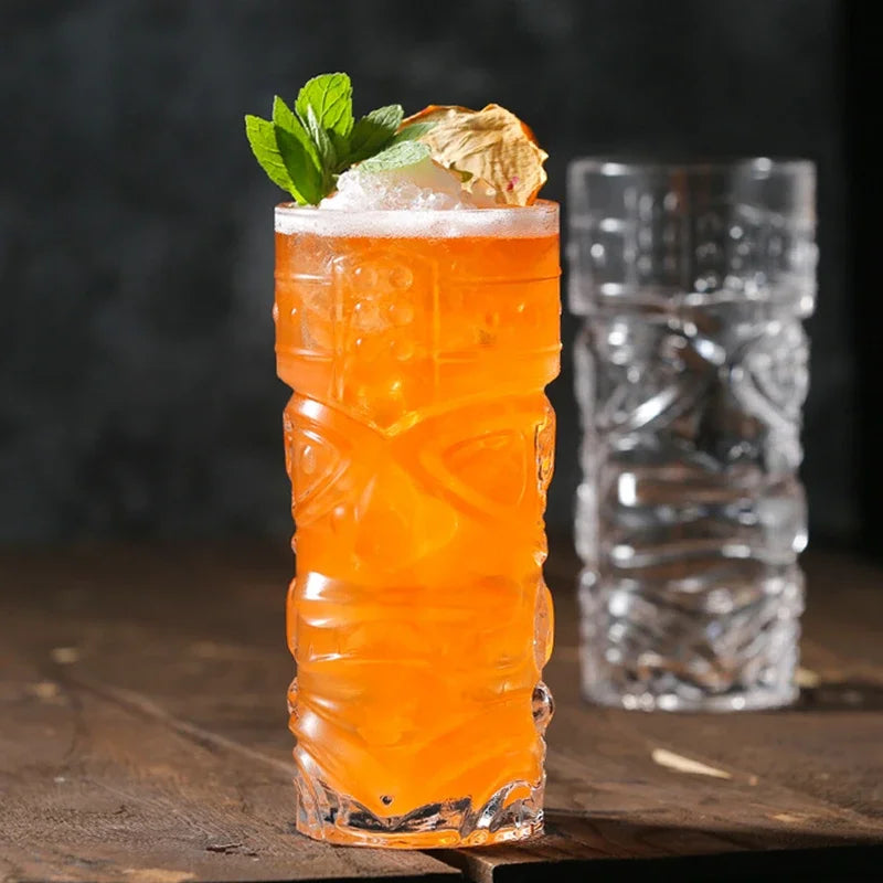 Vaso Tiki de vidrio transparente con capacidad de 420 ml, inspirado en los icónicos vasos Tiki de los años 50 y 60. Perteneciente a la categoría Drinkware y a la familia de vasos tipo tumbler, es ideal para amantes de cócteles y decoraciones temáticas, ya que añade un toque retro y tropical a cada bebida.