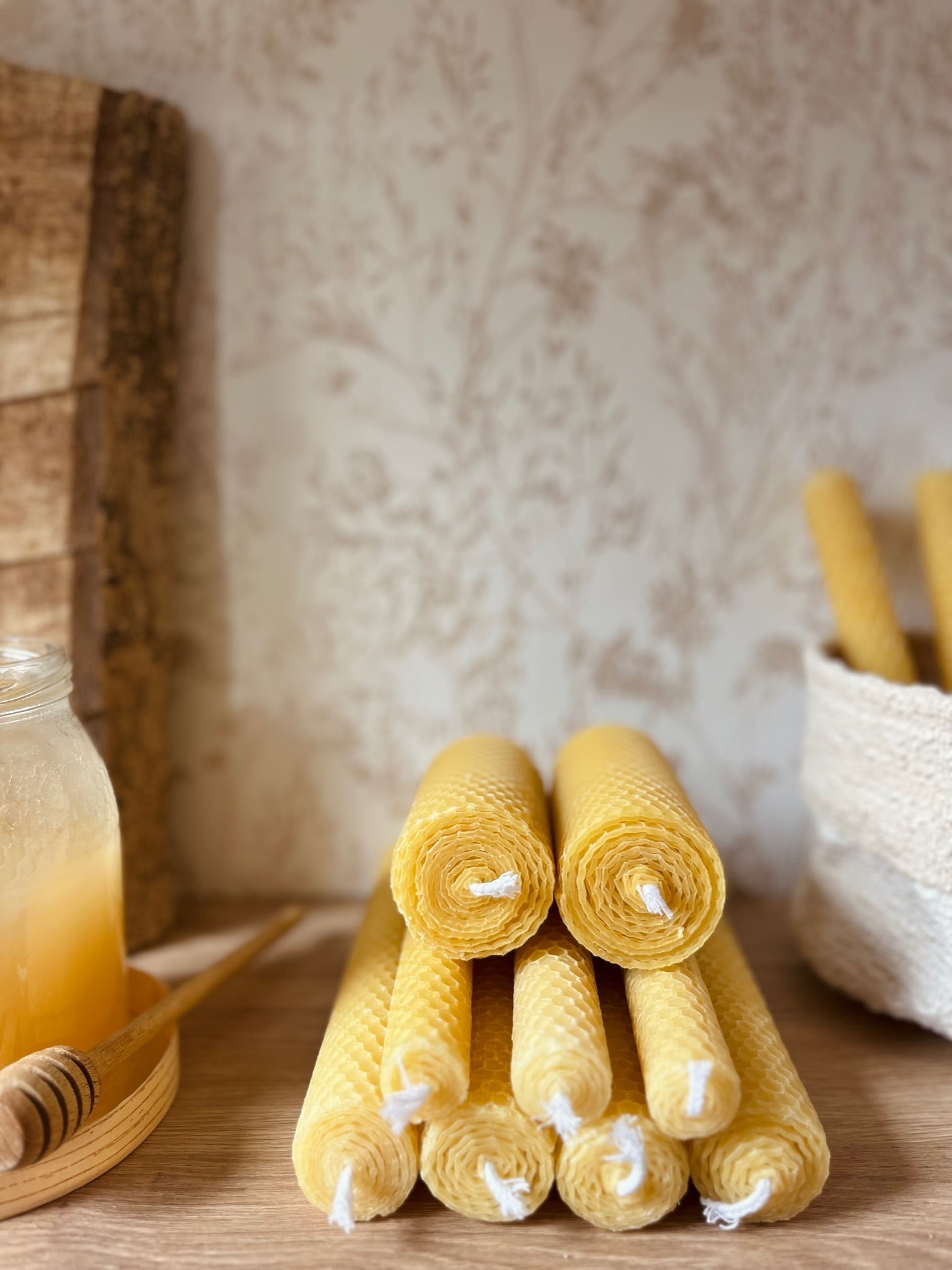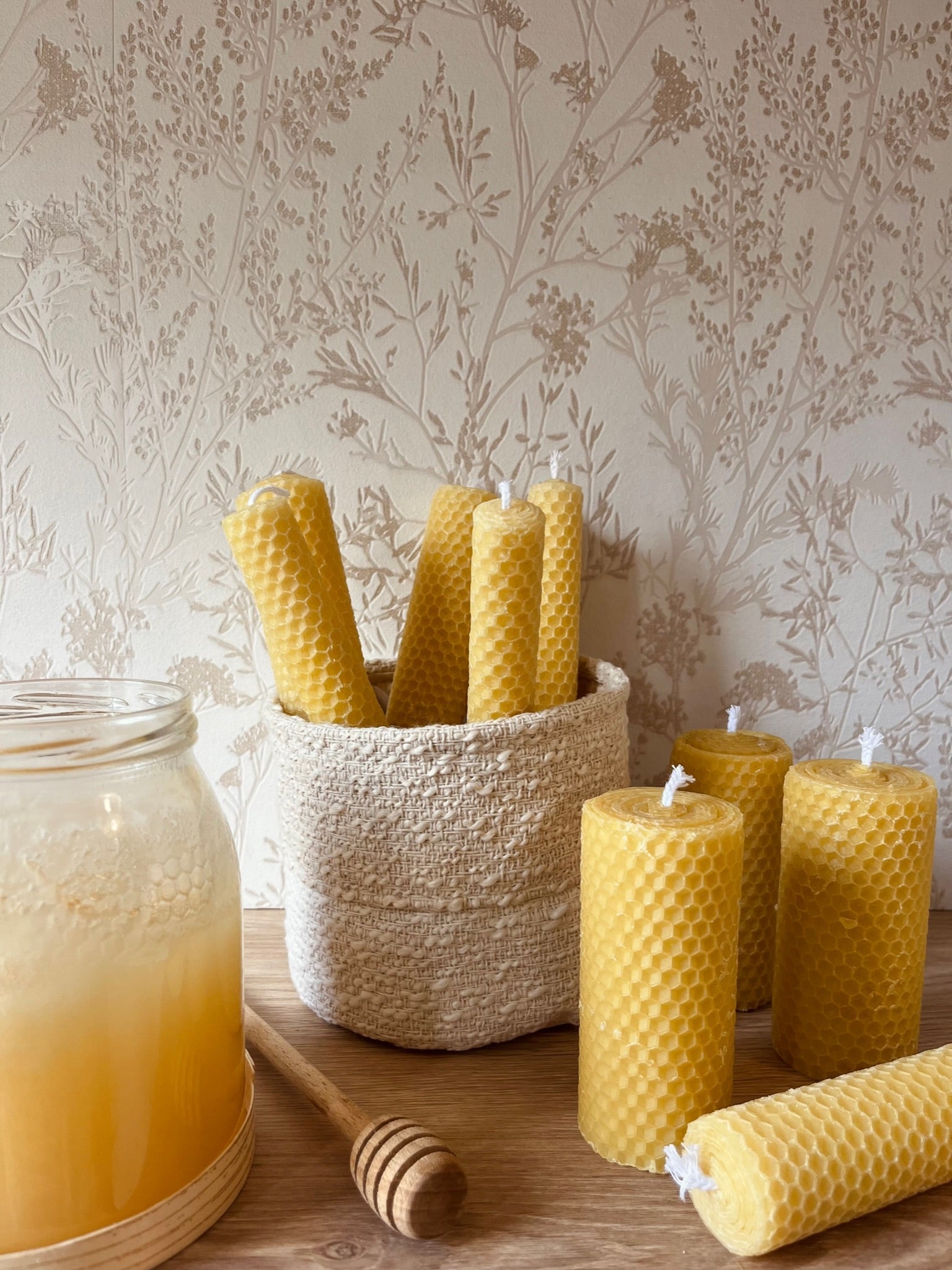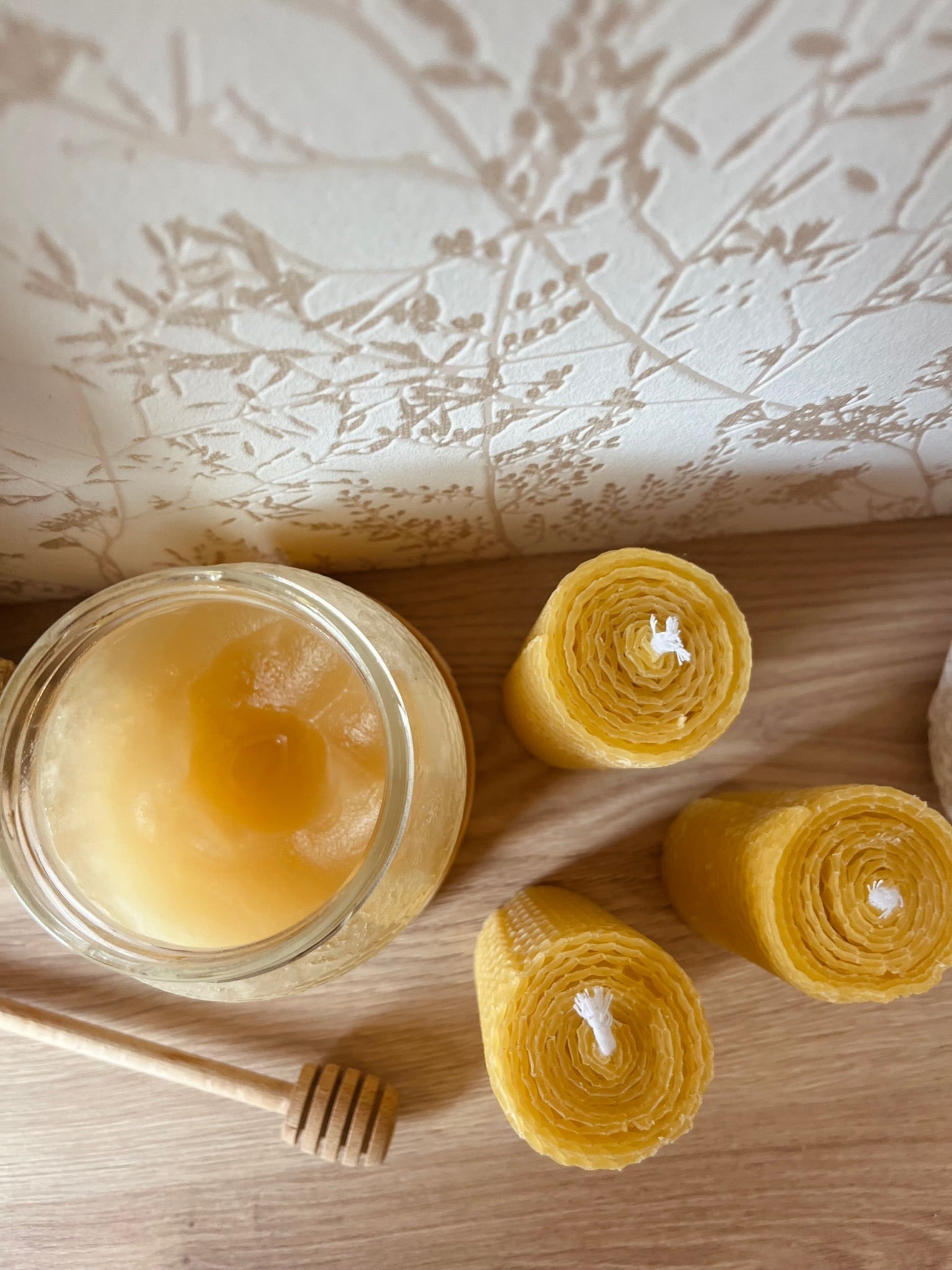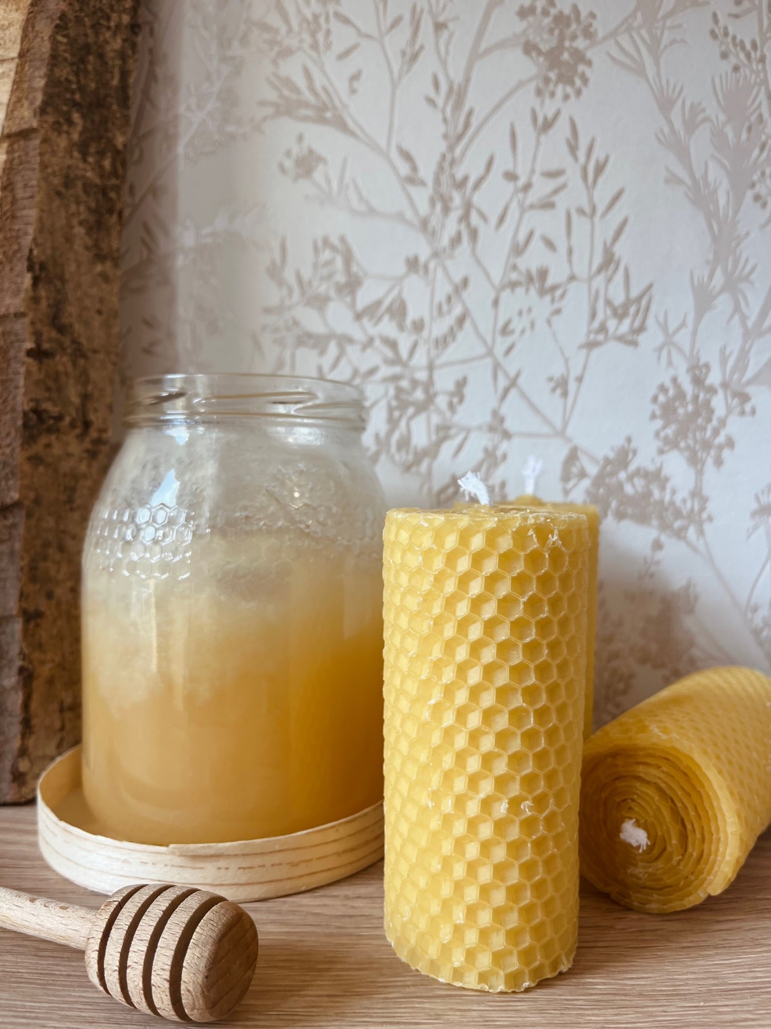 • Material y origen: Cera de abeja 100% natural elaborada a partir de láminas de cera pura provenientes directamente de un apicultor.