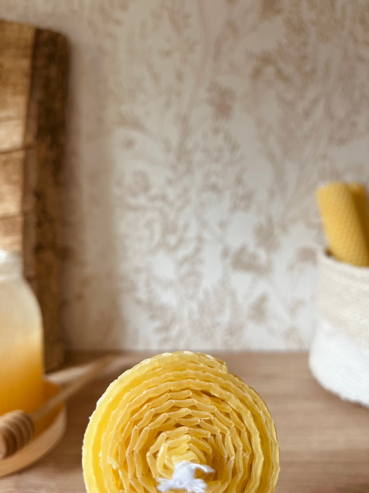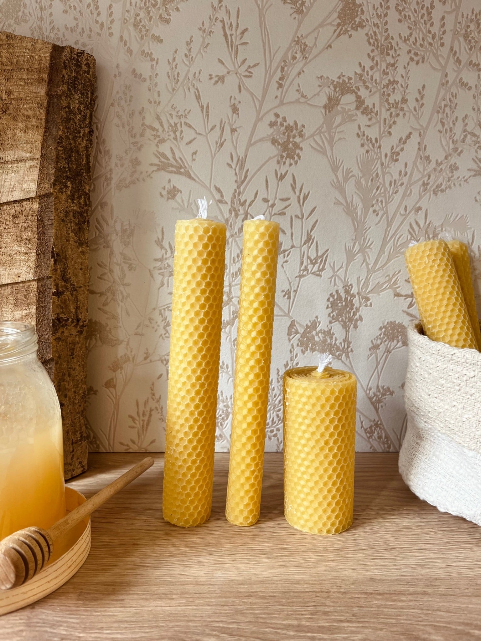 • Enrollable a mano y acabado: Cada vela se enrolla a mano, manteniendo la forma clásica y la textura hexagonal típica de las láminas de cera.