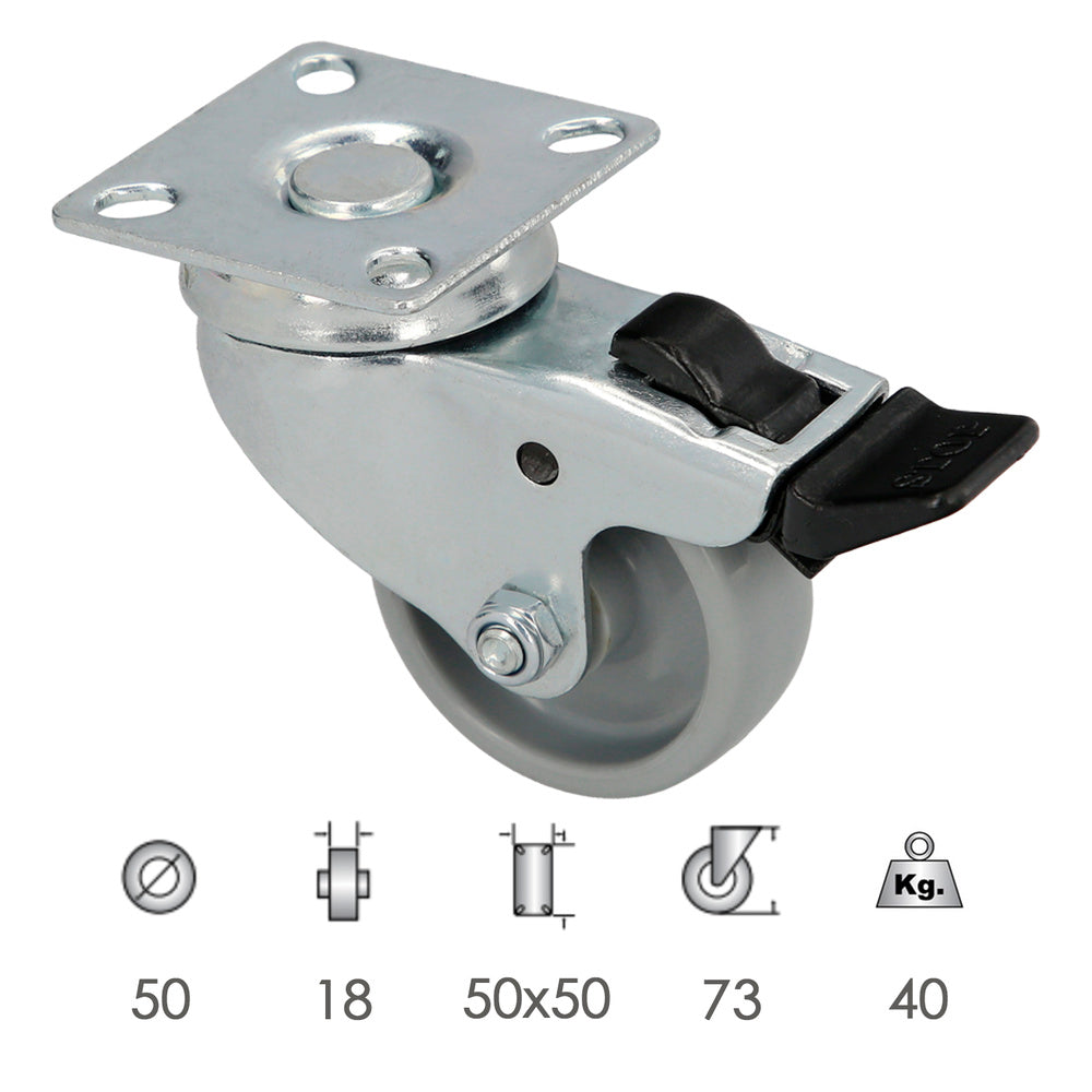 Rueda Domestica Ø 50 mm. Con Placa 50x50 mm. Con Freno