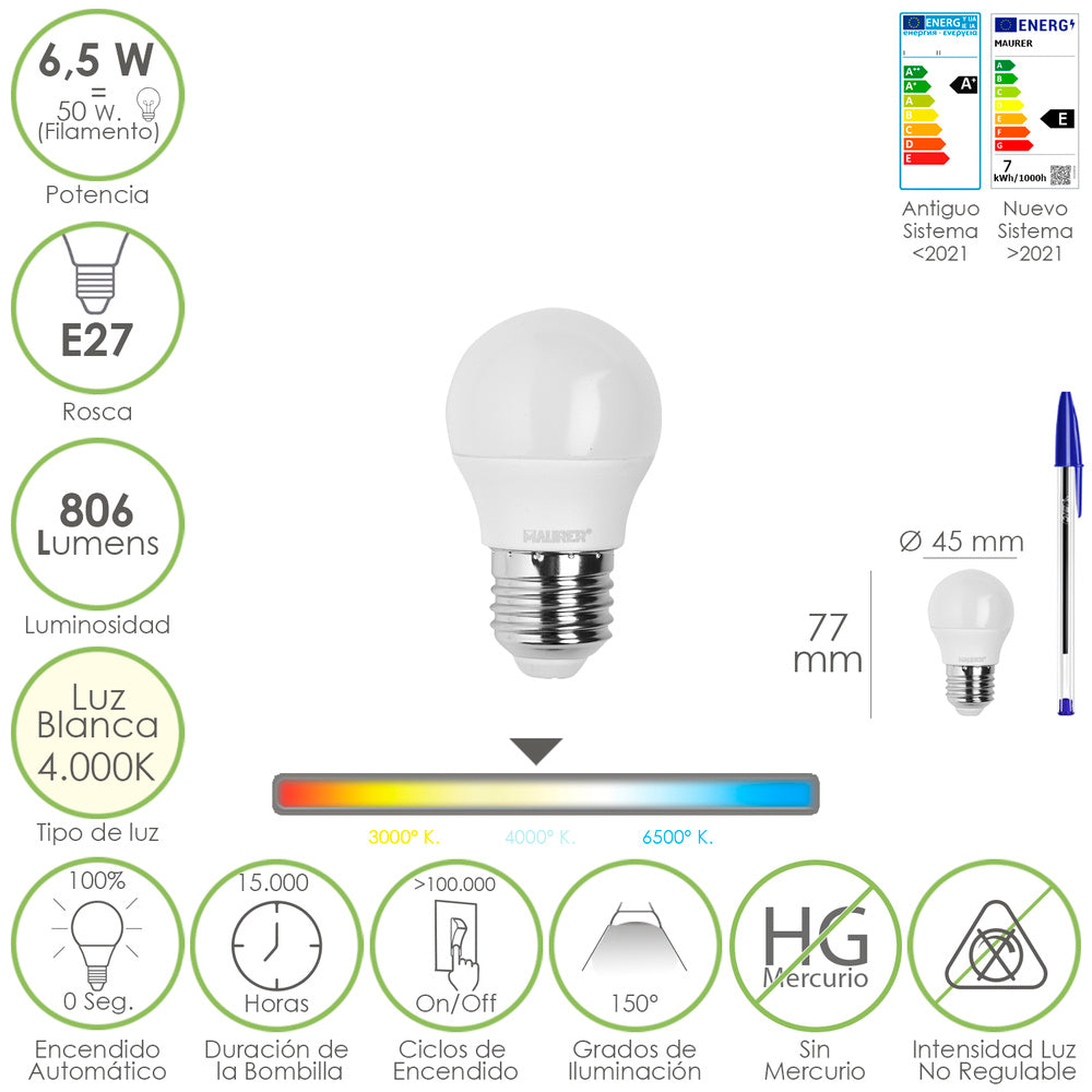 - Potencia: 6.5 W. equivalente a 50 W. aproximadamente de antigua incandescencia.