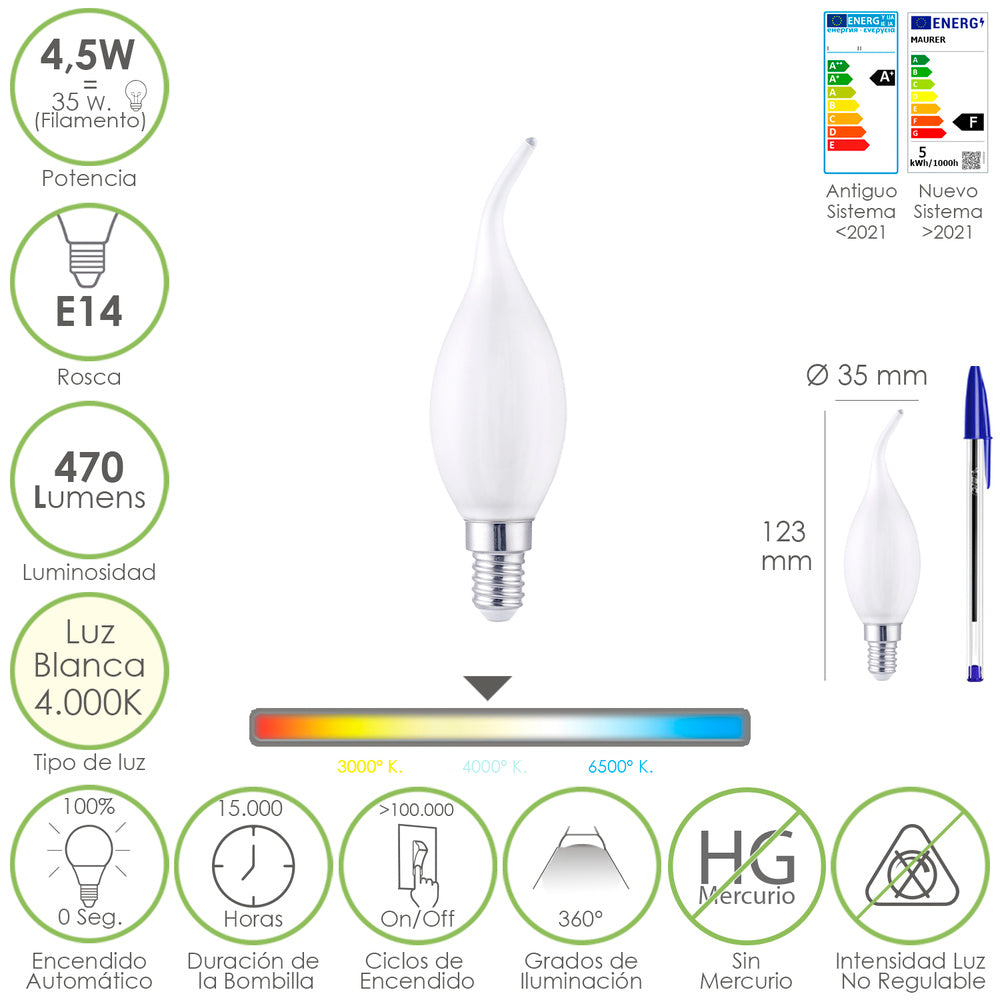 Bombilla Led Filamento Vela Llama Esmerilada E14. 4,5 Watt. Equivale A 35 Watt. 470 Lumenes. Luz Neutra 4000º K.