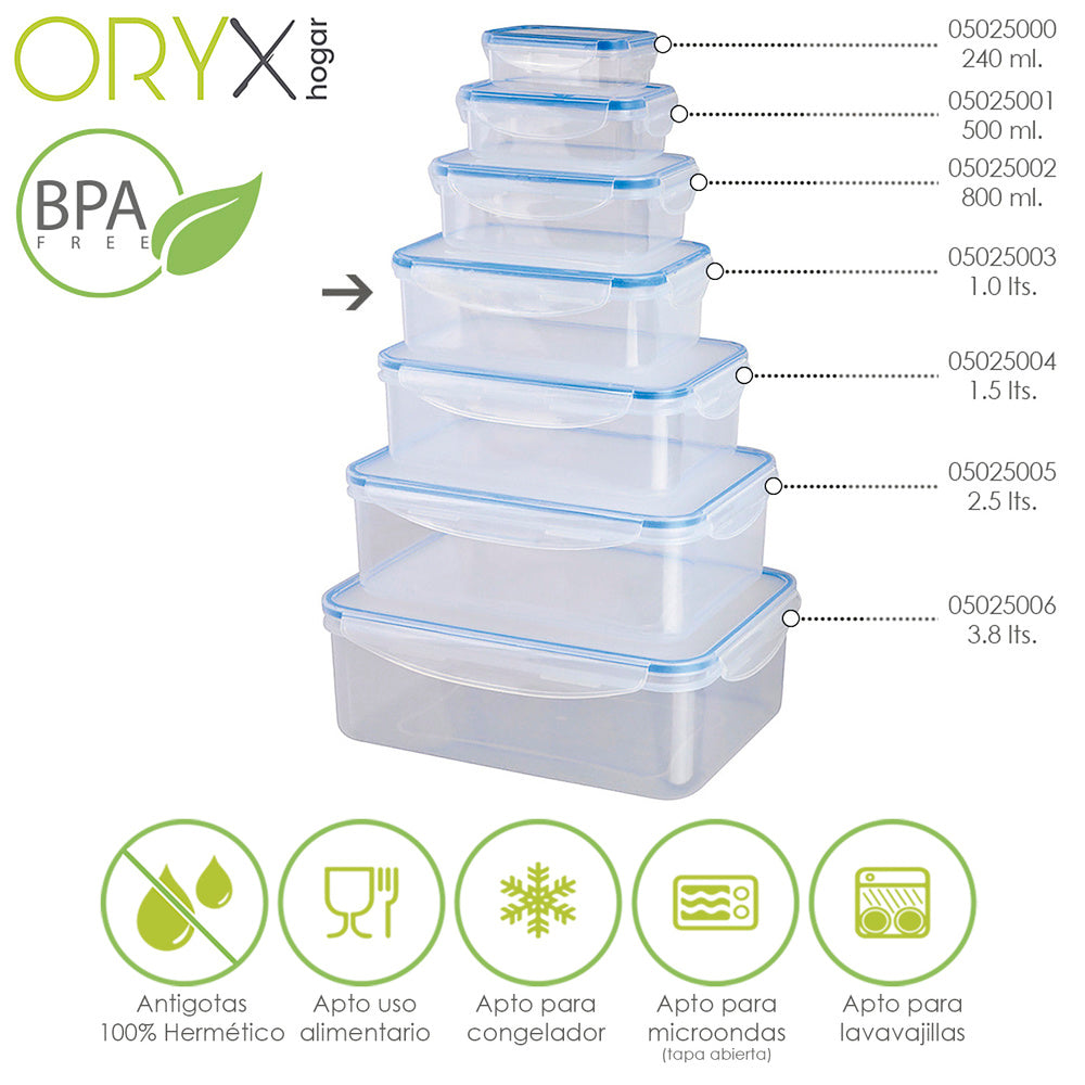 - Recipientes herméticos para una mejor conservación y un transporte sin derrames. Las tapas cuentan con un sistema de 4 cierres de bloqueo además están realizadas en silicona inyectada que se adhiere al recipiente aislando los alimentos de gérmenes y olores externos y favoreciendo su perfecta conservación.