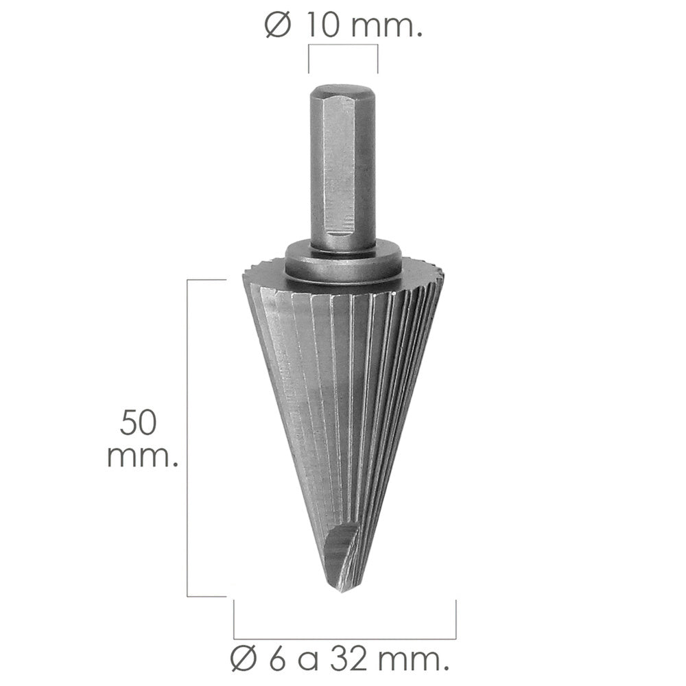 - Forma cónica ideal para agrandar orificios, biselar bordes y realizar cortes precisos en ángulo.