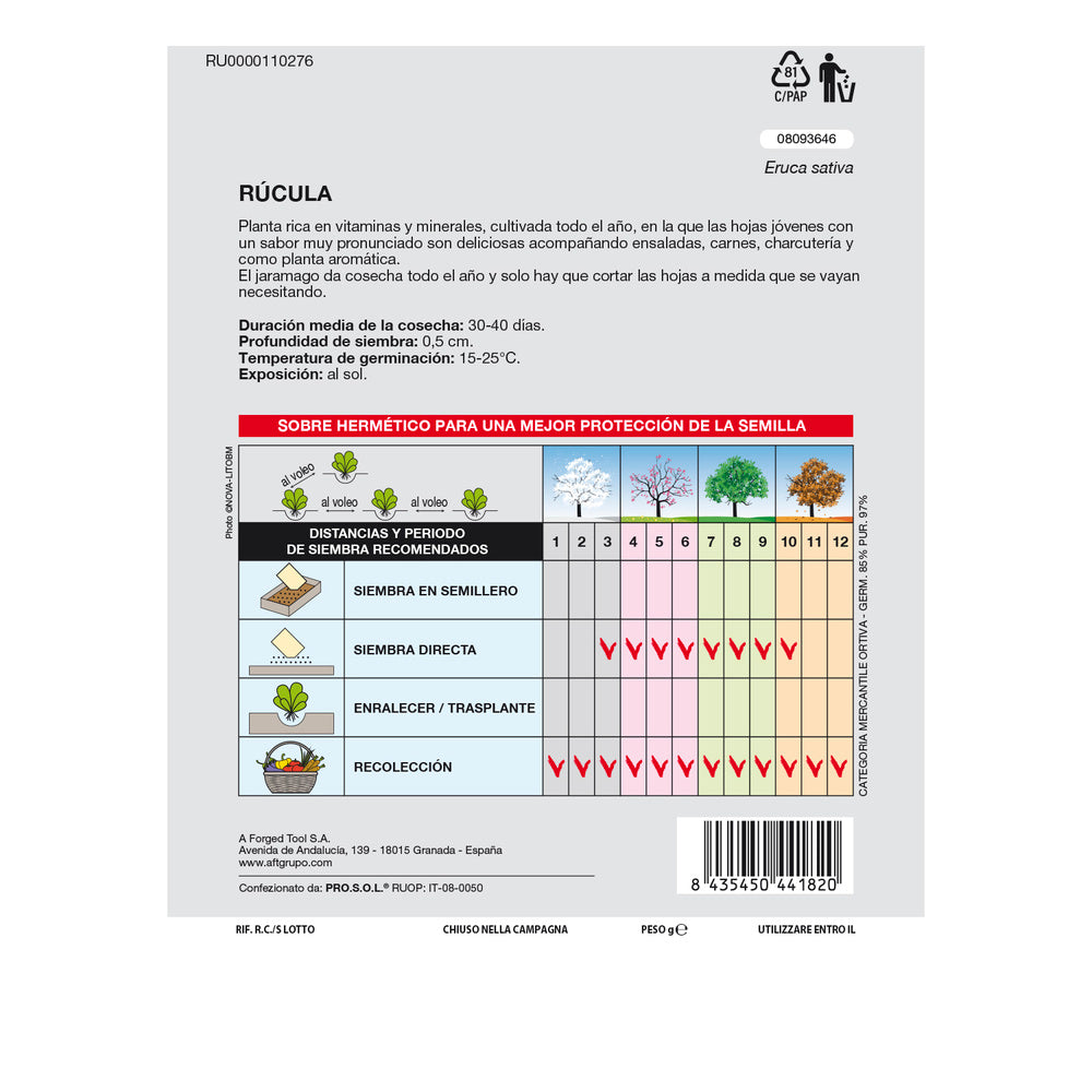 Semillas rucula (9 gramos) semillas verduras, horticultura, horticola, semillas huerto