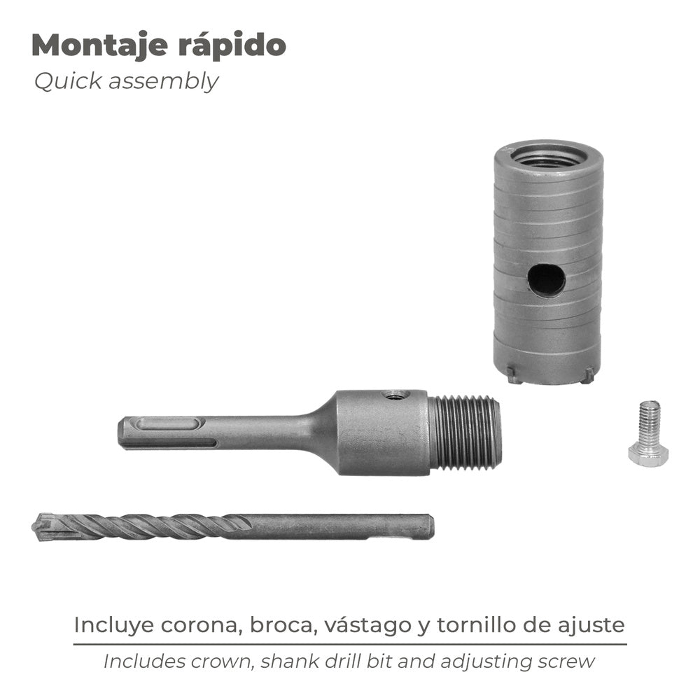 - El portabrocas tiene un tornillo para desmontar la sierra de corona y la broca con facilidad. Las puntas endurecidas proporcionan un corte más suave y rápido sin vibraciones.
