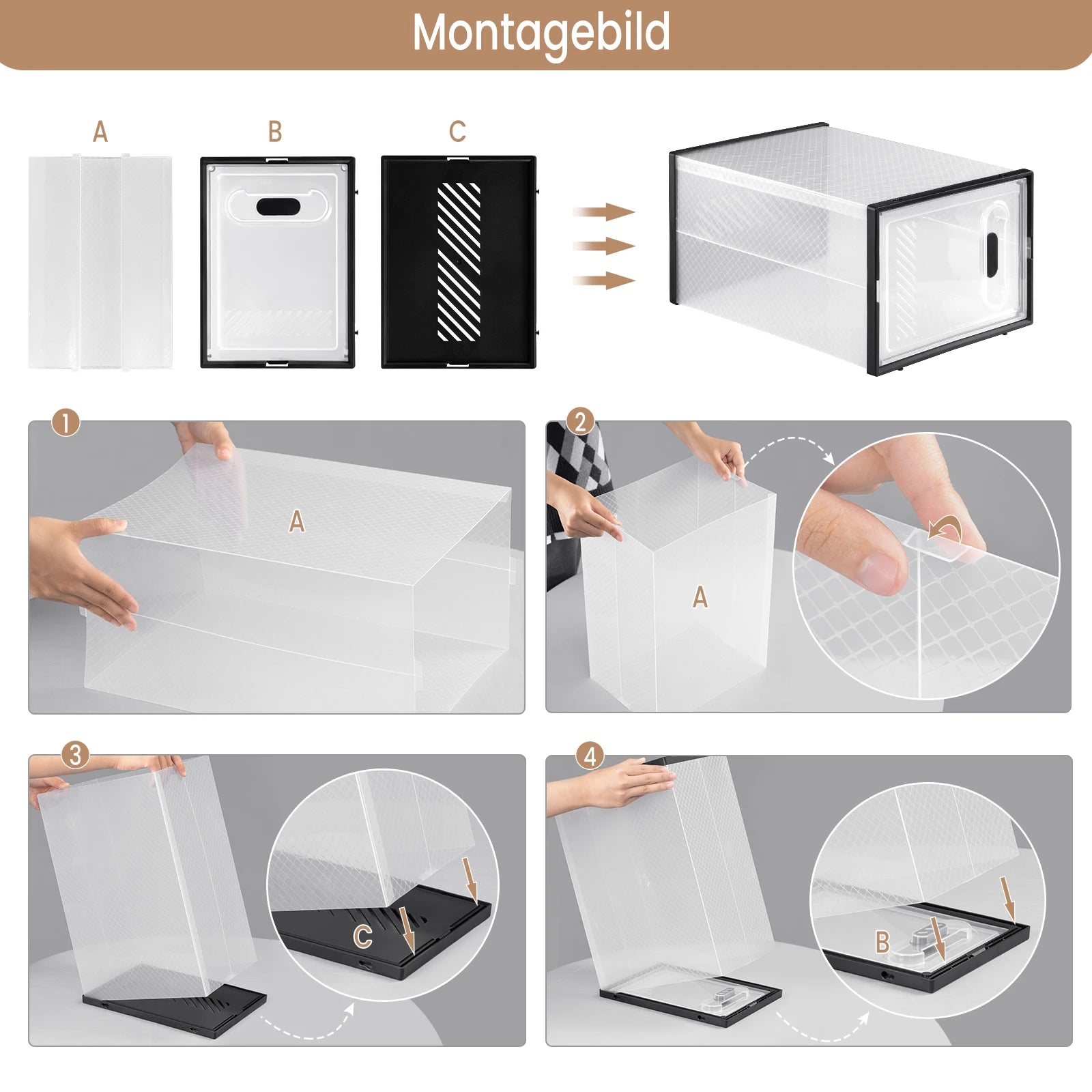 Estas cajas de zapatos apilables con puerta magnética ofrecen almacenamiento visible y seguro para tu calzado. Ideales para vestidores, dormitorios o entradas, permiten optimizar el espacio sin renunciar al estilo gracias a su color transparente y negro.
