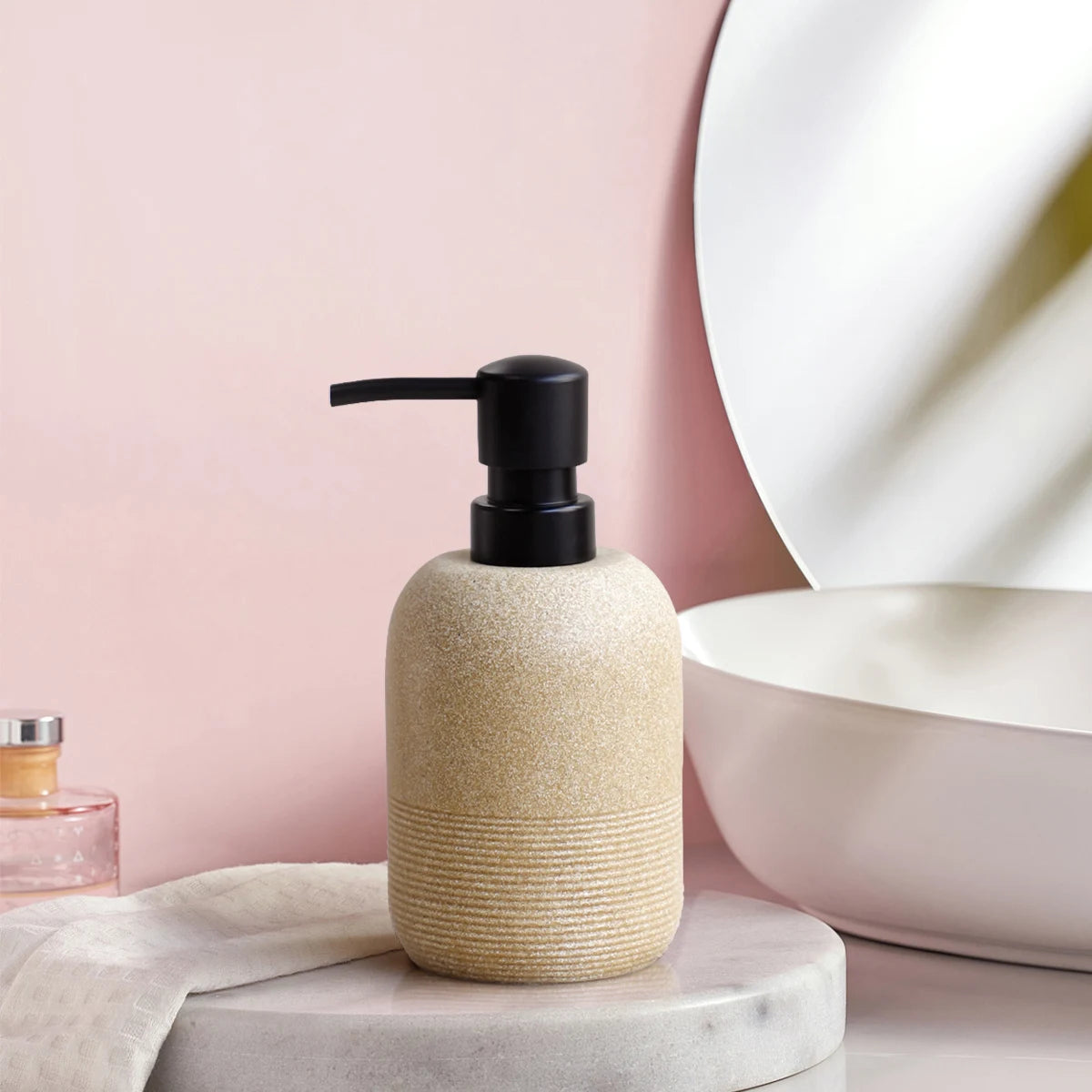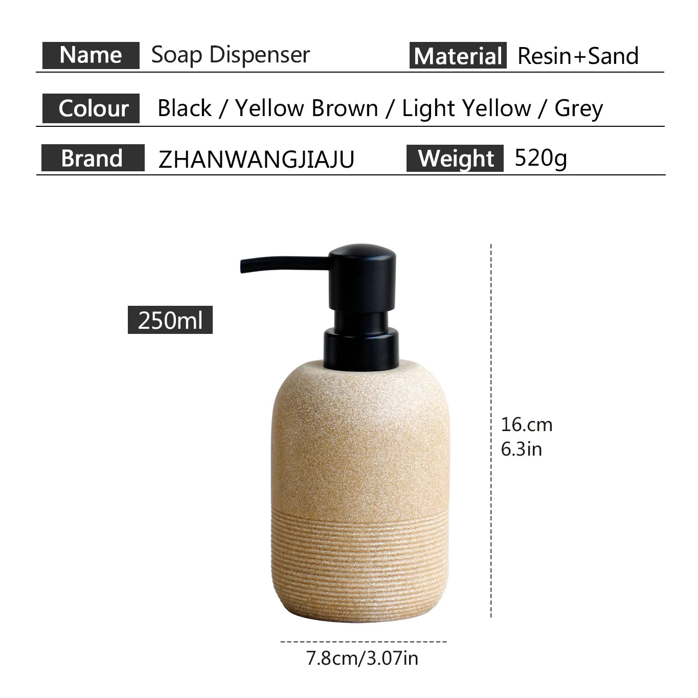 Dispensador de jabón recargable de 250 ml para cocina, baño y ducha. Fabricado en resina y arena, ofrece durabilidad y un acabado texturizado moderno que se adapta a cualquier estilo.
