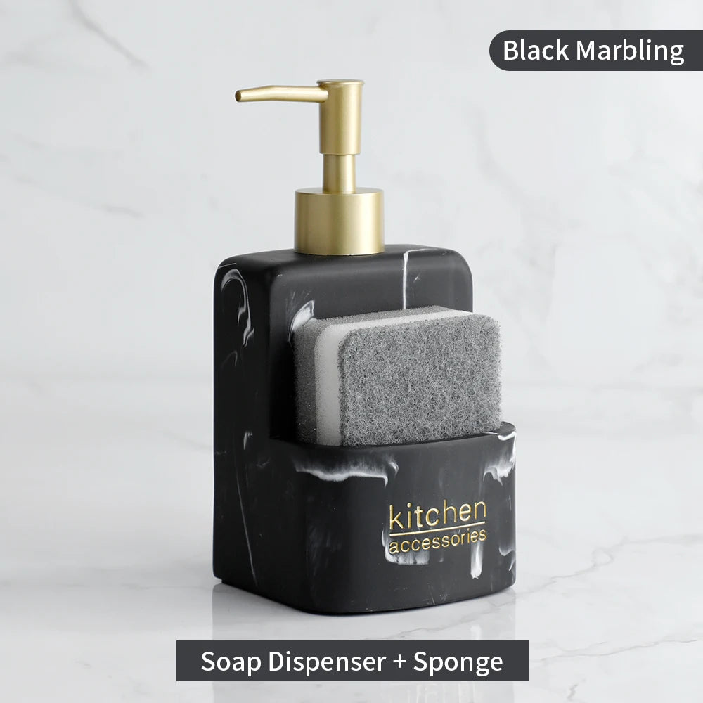 Dispensador de jabón de cocina de 350 ml con soporte para esponja, elaborado en resina con arena de alta calidad y acabado efecto mármol. Ideal para cocinas que buscan mantener el fregadero ordenado y aportar un toque de elegancia.