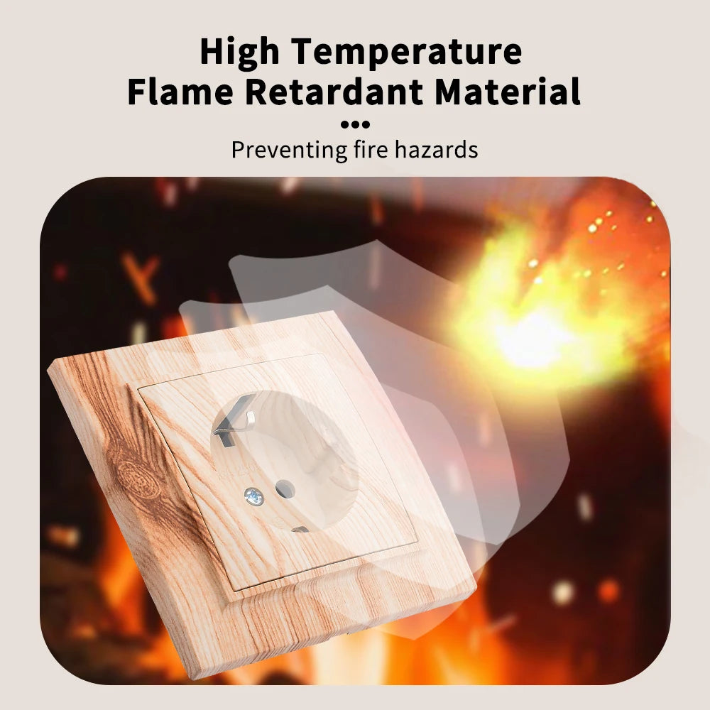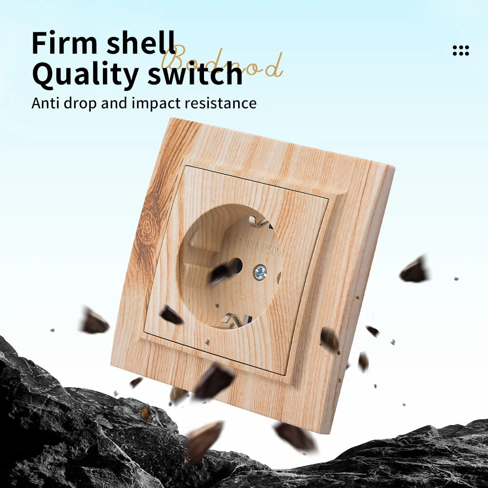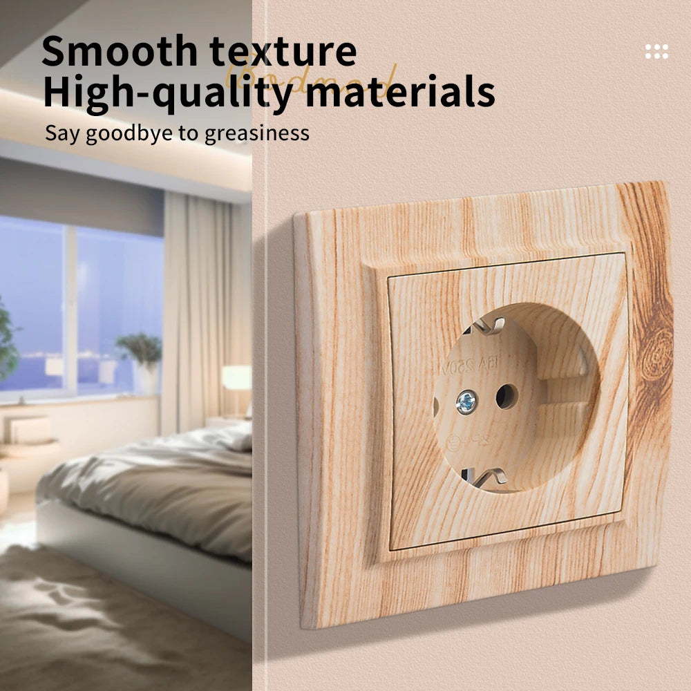 Enchufe empotrable con toma de tierra acabado madera marrón, pensado para instalaciones domésticas y comerciales. Aporta un toque cálido a la estancia manteniendo la seguridad eléctrica gracias al plástico retardante de llama y a la toma de tierra integrada.
