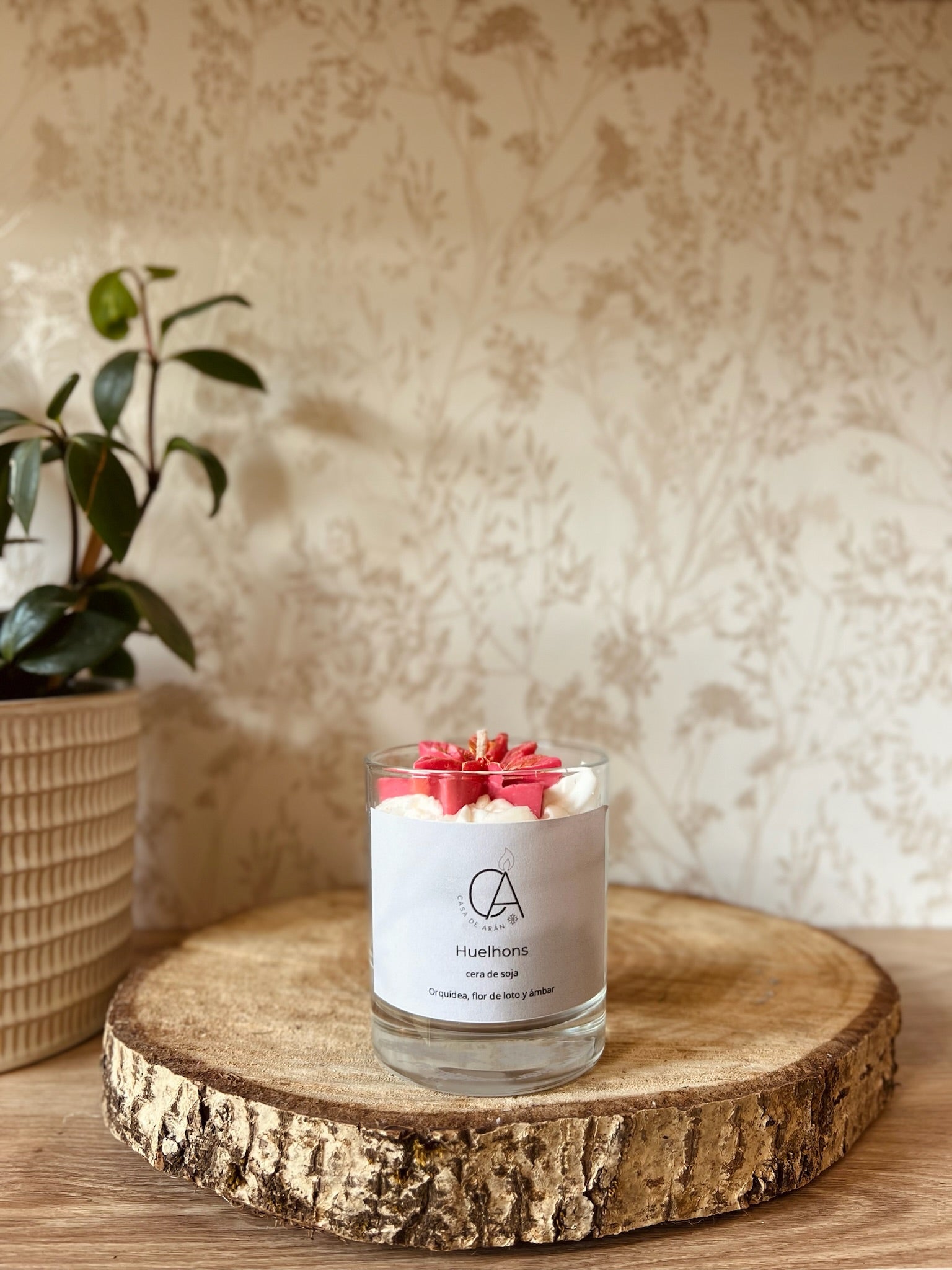 Vela aromática artesanal de Huelhons, en la variante "Pétalos", que fusiona orquídea, flor de loto y ámbar para llenar cualquier rincón de calma y elegancia. Pensada para quienes buscan serenidad y un momento de cuidado personal en casa.