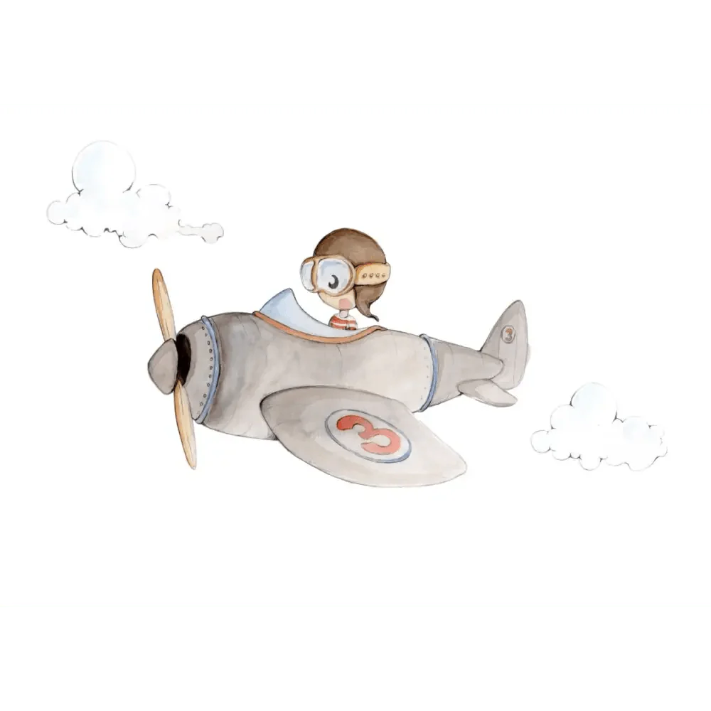 El vinilo infantil redondo de 95 cm con la ilustración "Cuco el Aviador" es una reproducción de alta calidad de un dibujo pintado a mano con acuarelas, impreso en soporte vinílico mate. Ideal para decorar habitaciones infantiles y añadir un toque especial que inspire la imaginación de los más pequeños.