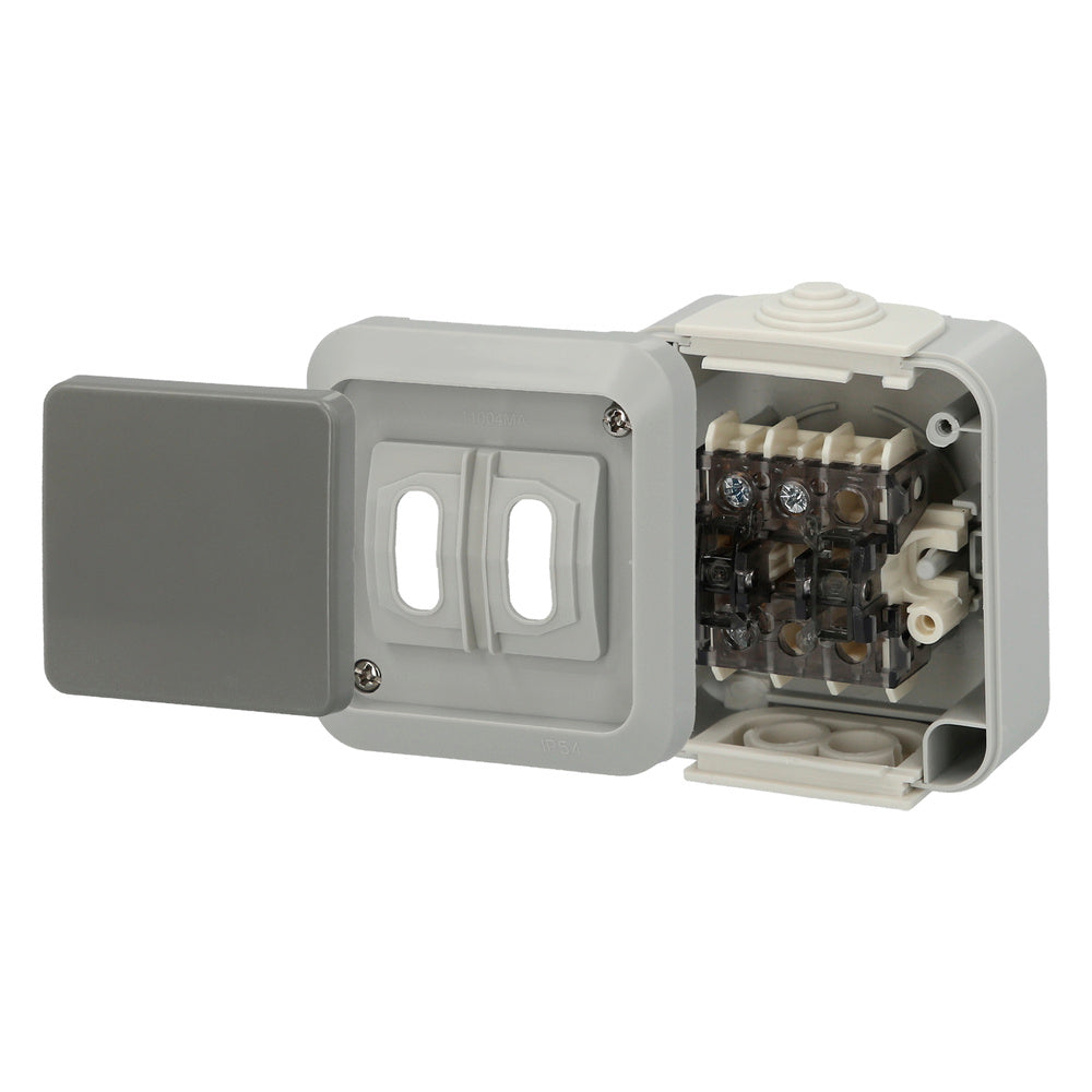- Este interruptor ha sido diseñado para resistir las inclemencias del tiempo, ofreciendo protección contra la humedad y el polvo, lo que lo convierte en la opción perfecta para ser utilizado en espacios exteriores.