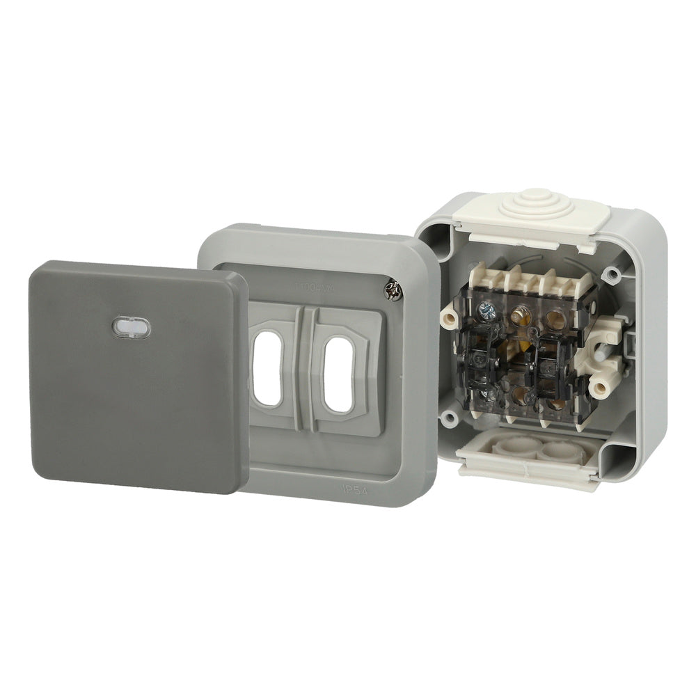 - Este interruptor está diseñado para resistir las adversidades climáticas, ofreciendo protección contra la humedad y el polvo, convirtiéndolo en una opción ideal para espacios exteriores.