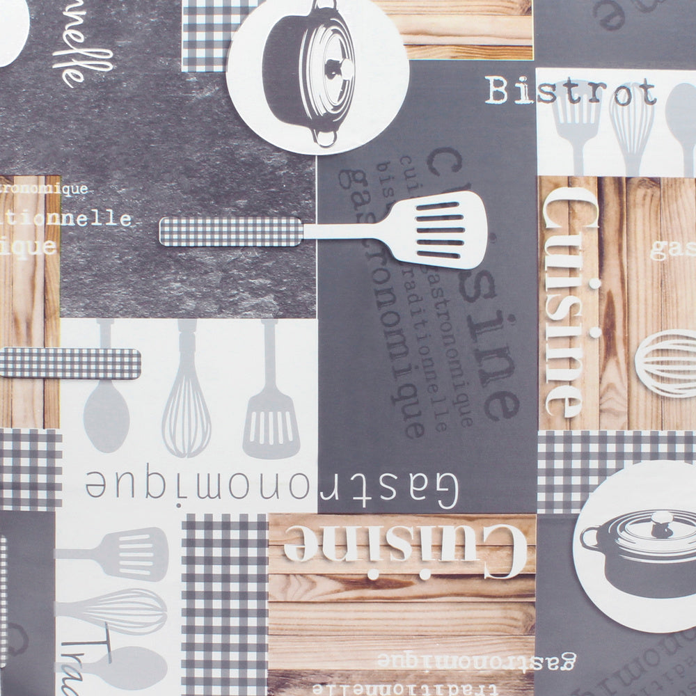 - Mantel Hule estampado en tonos grises y madera con formas de utensilios de cocina. Diseño moderno y elegante para cualquier ocasión.