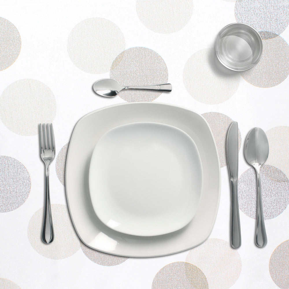 - Mantel Hule estampado en color blanco con formas circulares en tonos de gris y beige. Diseño moderno y elegante para cualquier ocasión.
